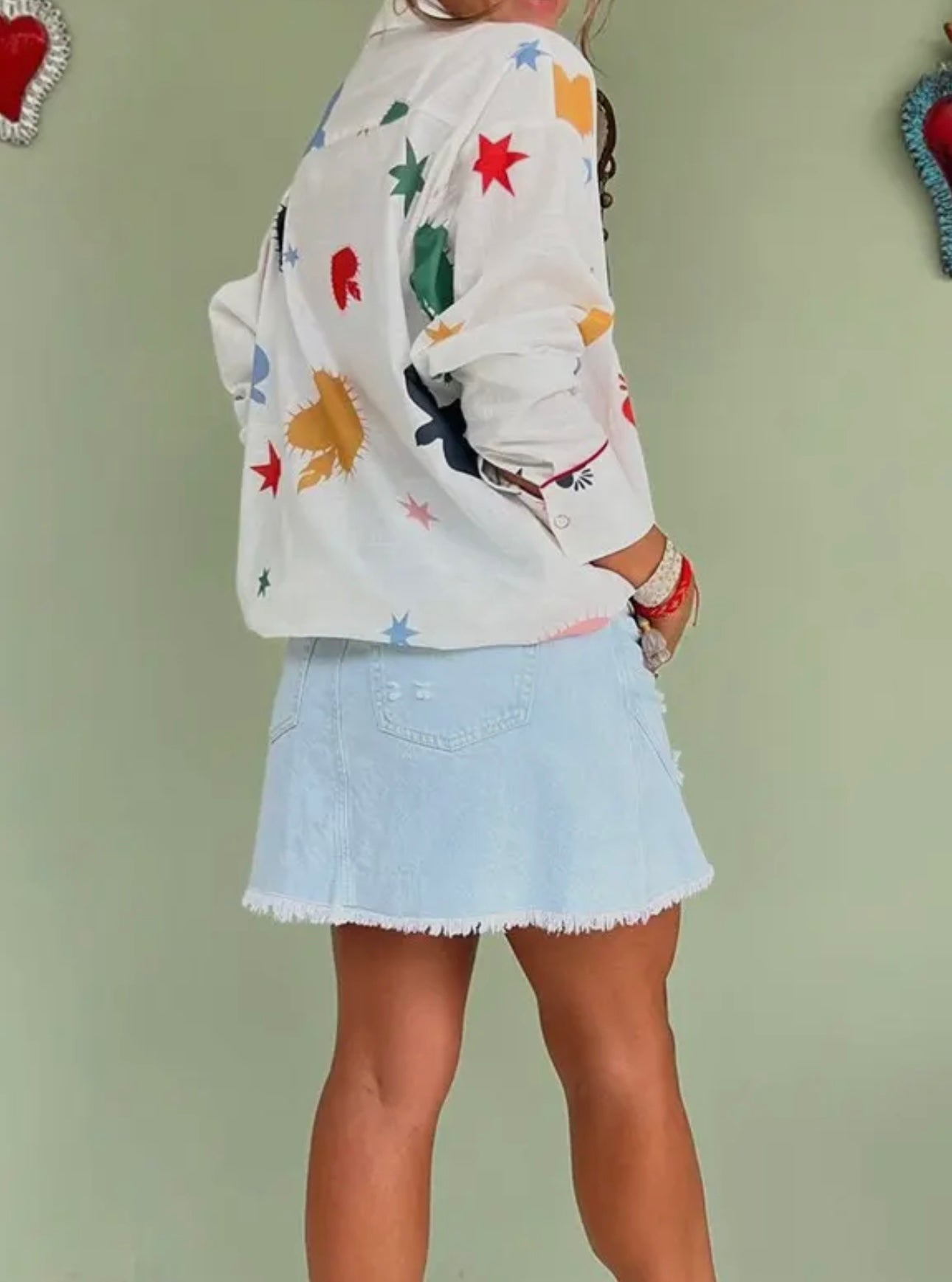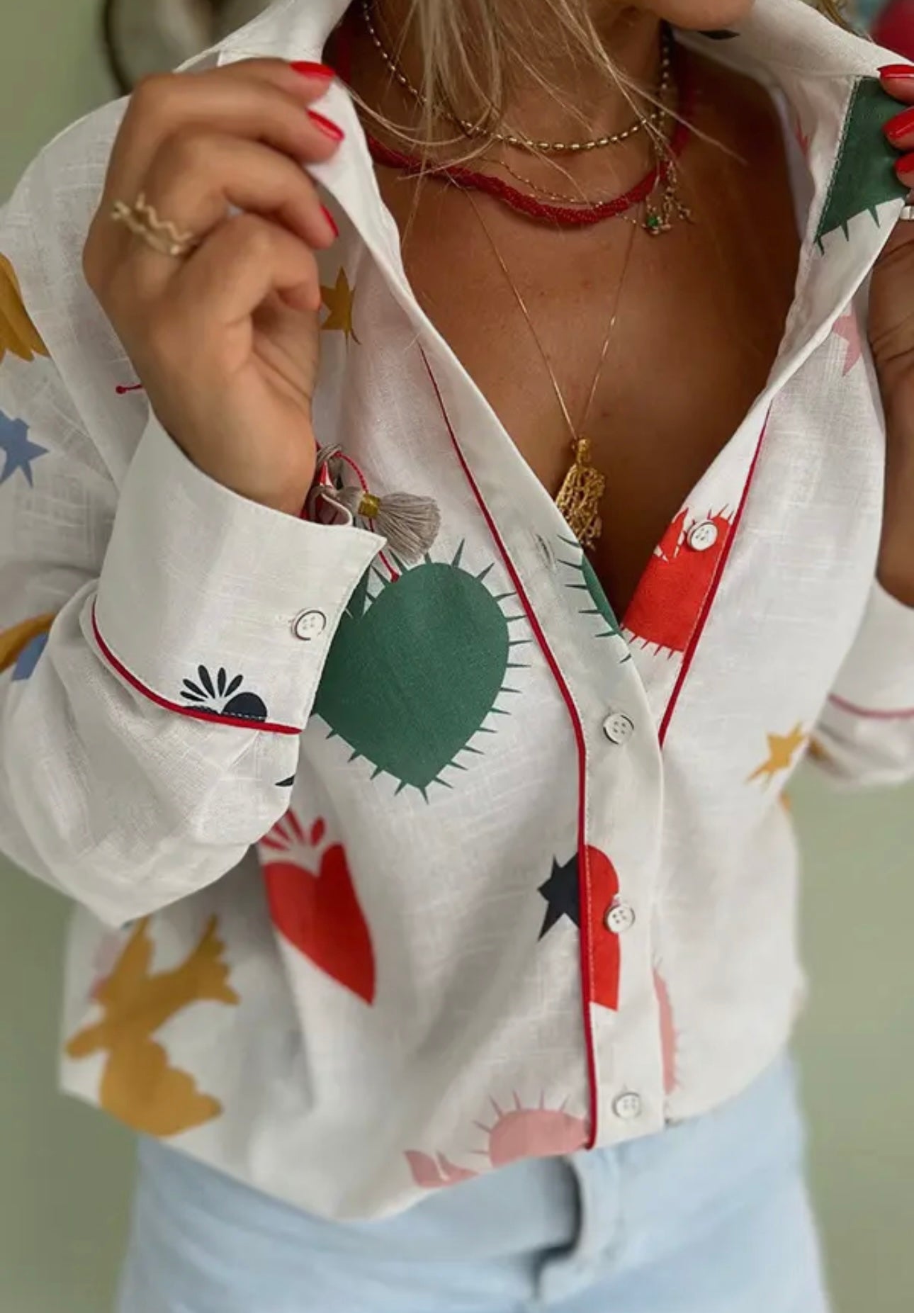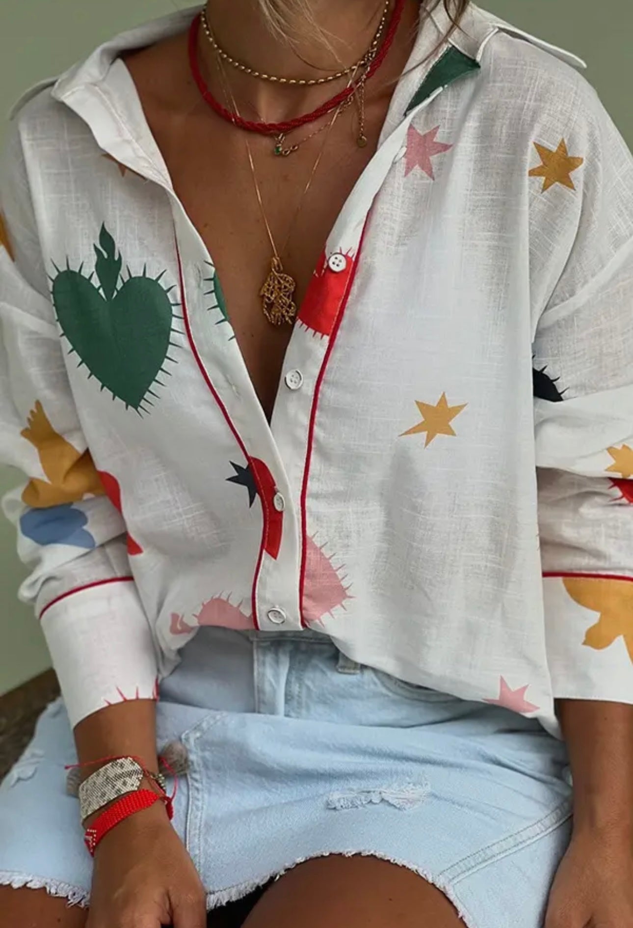 Add a touch of charm to your wardrobe with our Katie Shirt. Featuring a delicate pattern of hearts and stars, perfect for those who love a playful yet sophisticated style.
