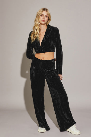 The Akima Jacket is sleek, cropped, and irresistibly soft — a tailored velvet piece that adds instant polish and allure. Designed with a deep V-neckline and a structured fit, it’s perfect for layering over high-waisted pants or pairing with the matching Akima Trousers for a bold statement look.