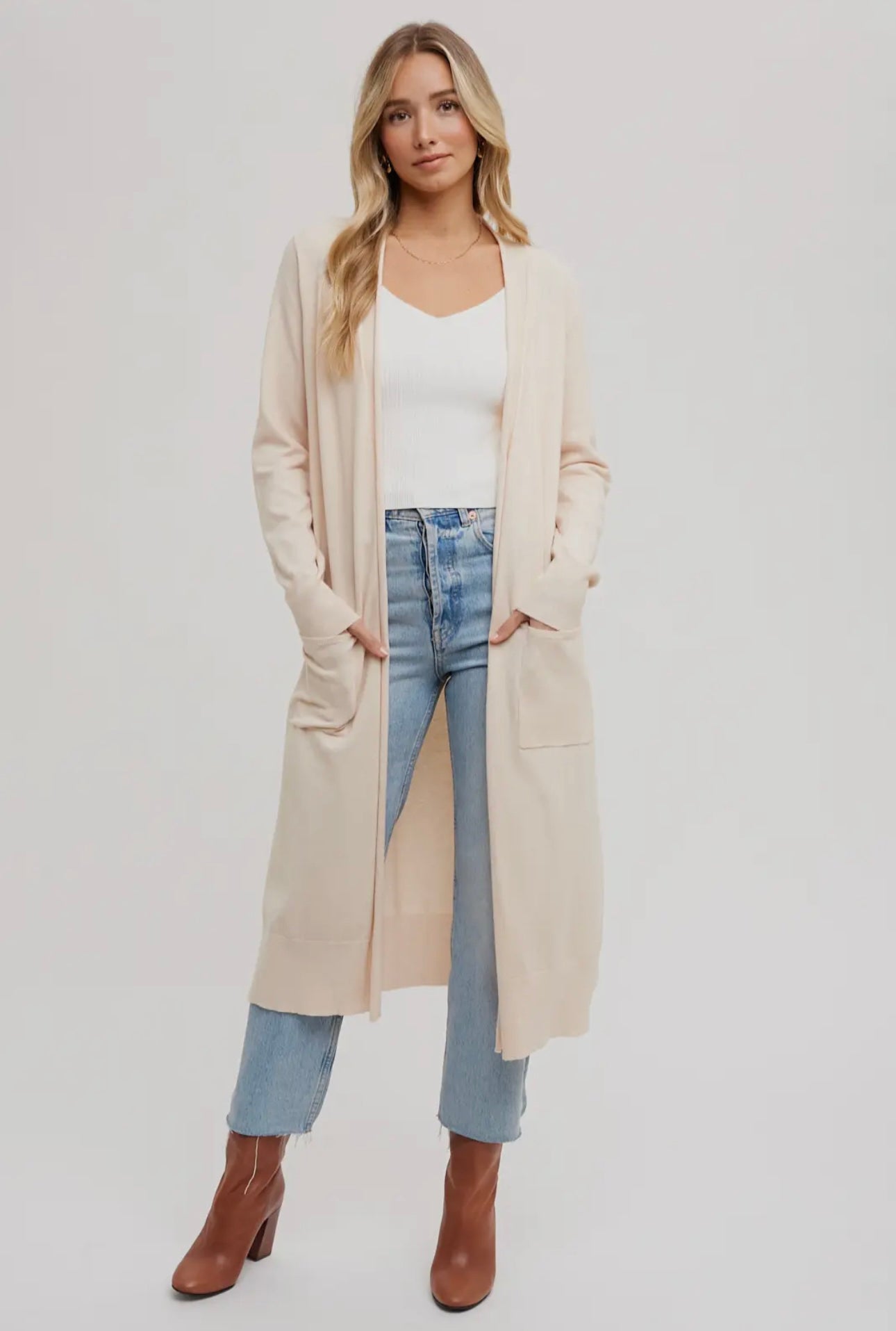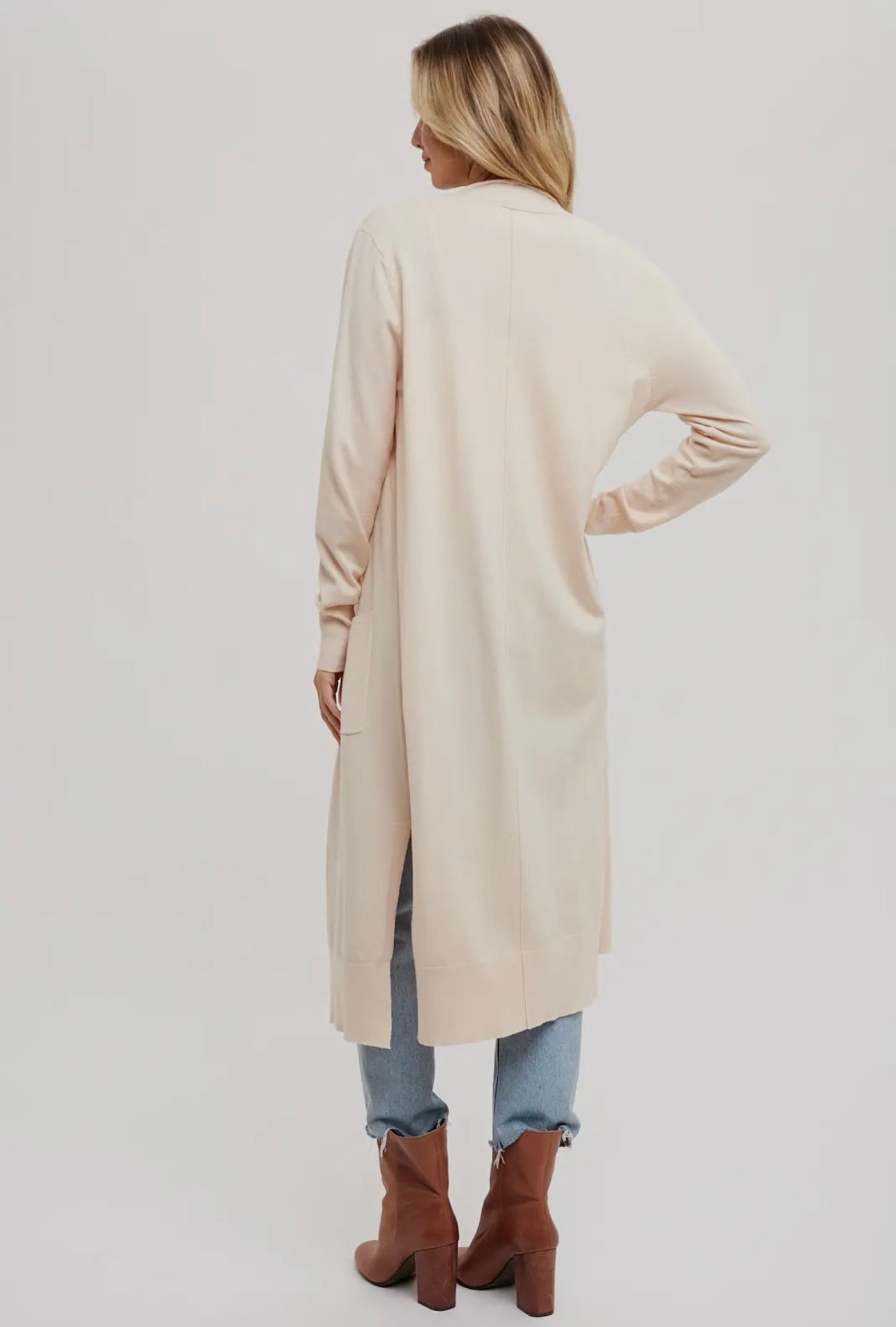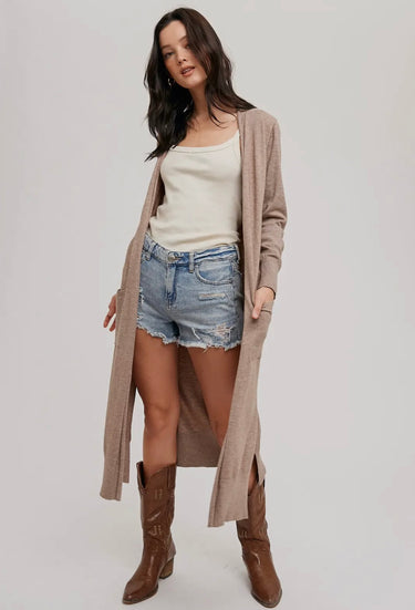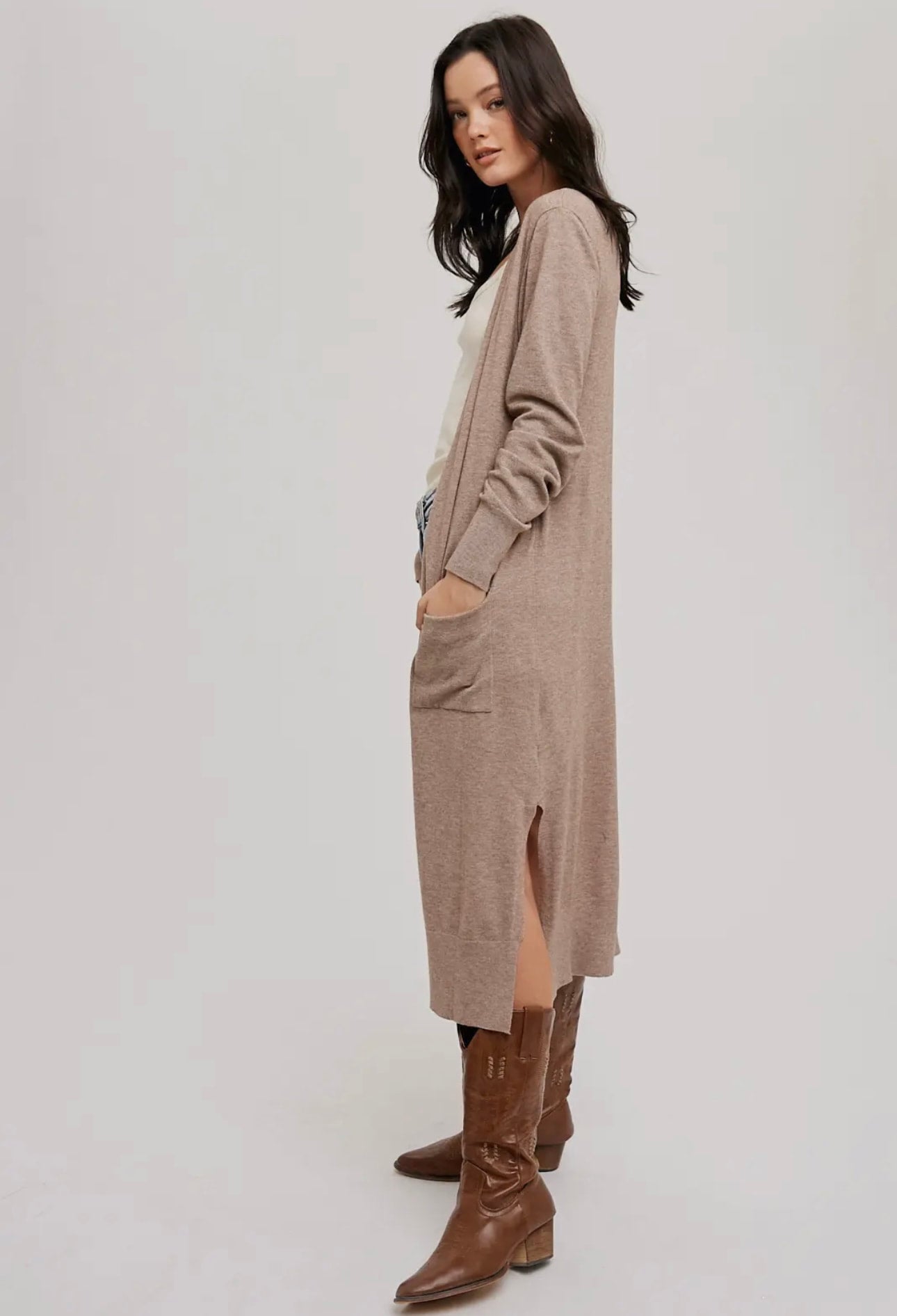 An effortless longline cardigan designed in a warm neutral hue. With its soft drape and side slits, it’s the perfect layer for transitional days and cozy evenings. Wear it over denim or dresses for instant laid-back sophistication.