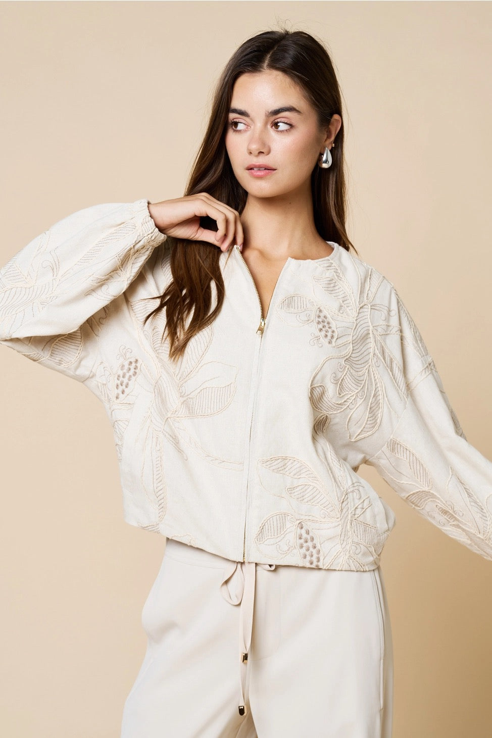 This embroidered zip-front jacket features a relaxed silhouette with delicate tonal detailing for a refined, everyday layer.