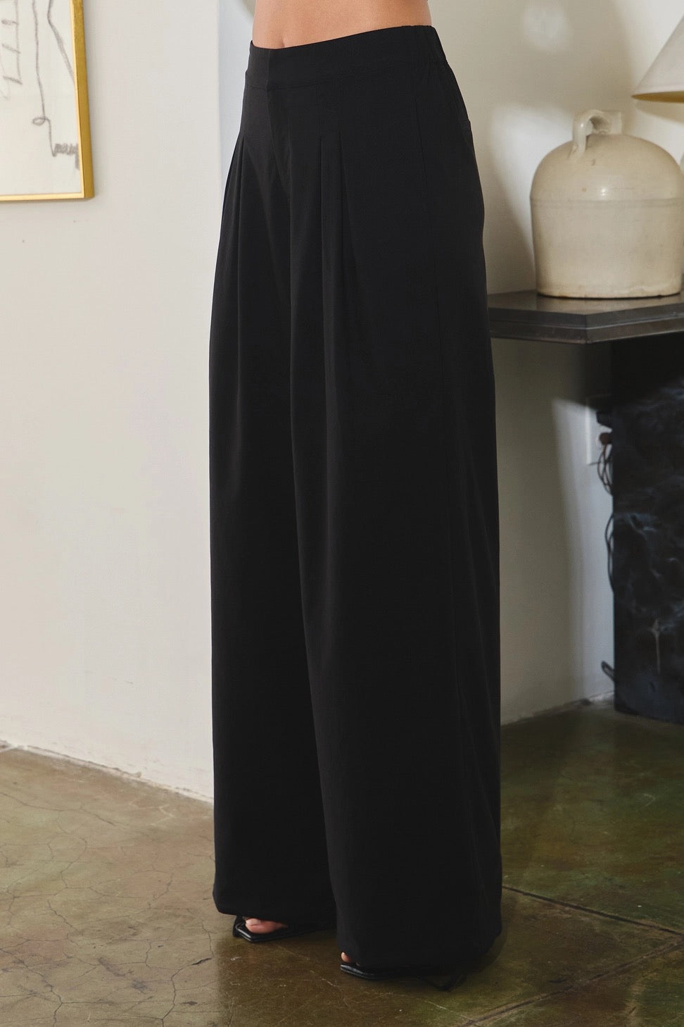 Elevate everyday style with these wide-leg trousers, designed in a stretchy woven fabric that moves with you. Featuring front pintuck details, side pockets, and a comfortable back elastic waistband, they deliver both polish and ease. The adjustable drawstring hem lets you wear them relaxed or cinched at the ankle for versatile styling. Effortless to dress up or down, they’re the perfect mix of tailored structure and modern comfort.