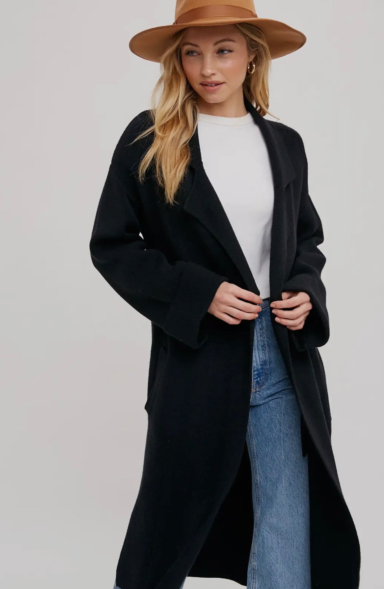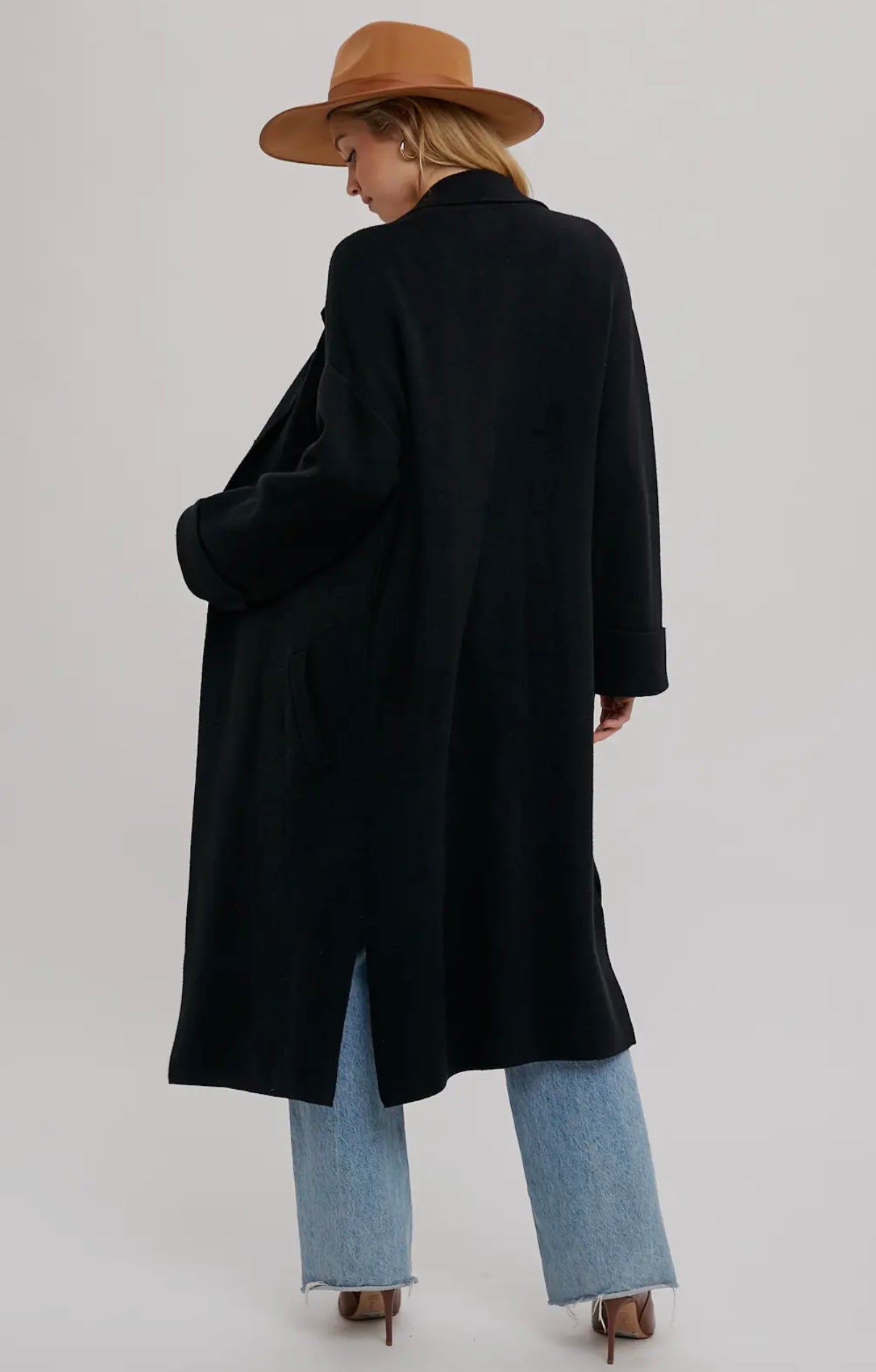 A sleek longline trench with a minimalist cut and soft drape. Designed in timeless black, it layers effortlessly over denim or dresses, making it your go-to piece for fall and winter sophistication.