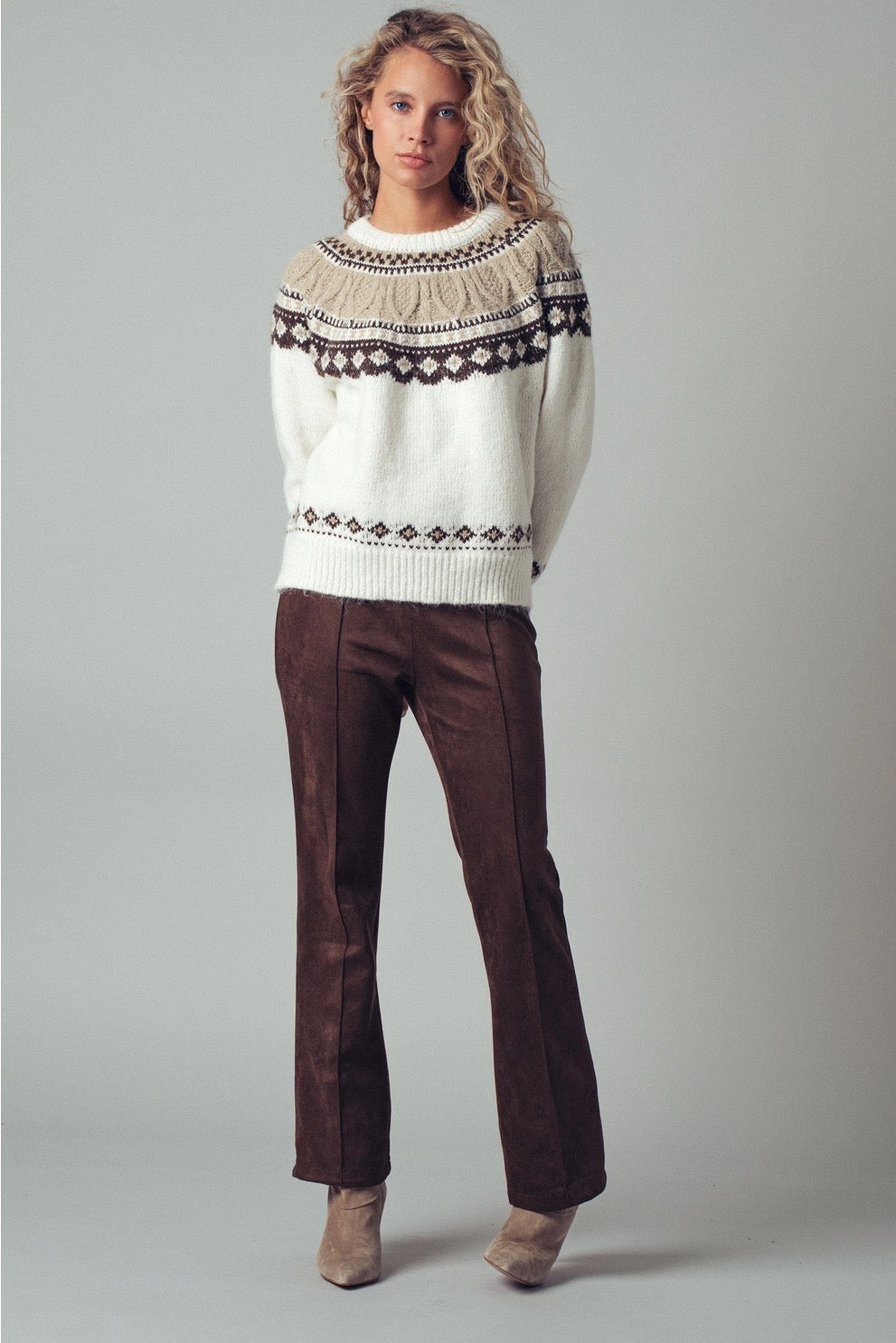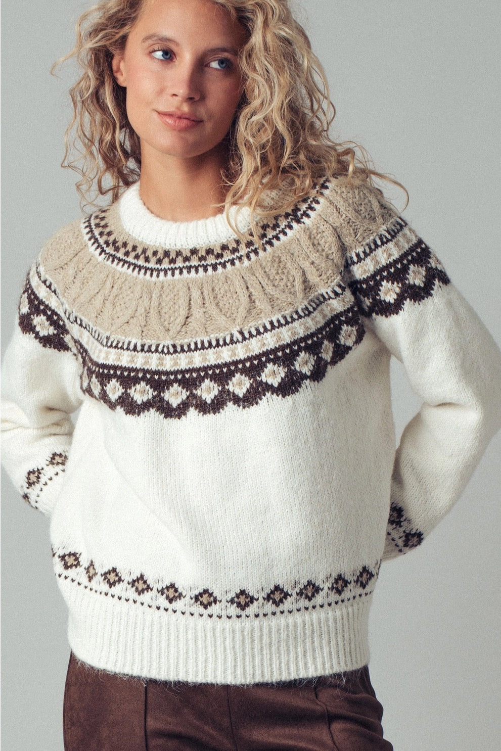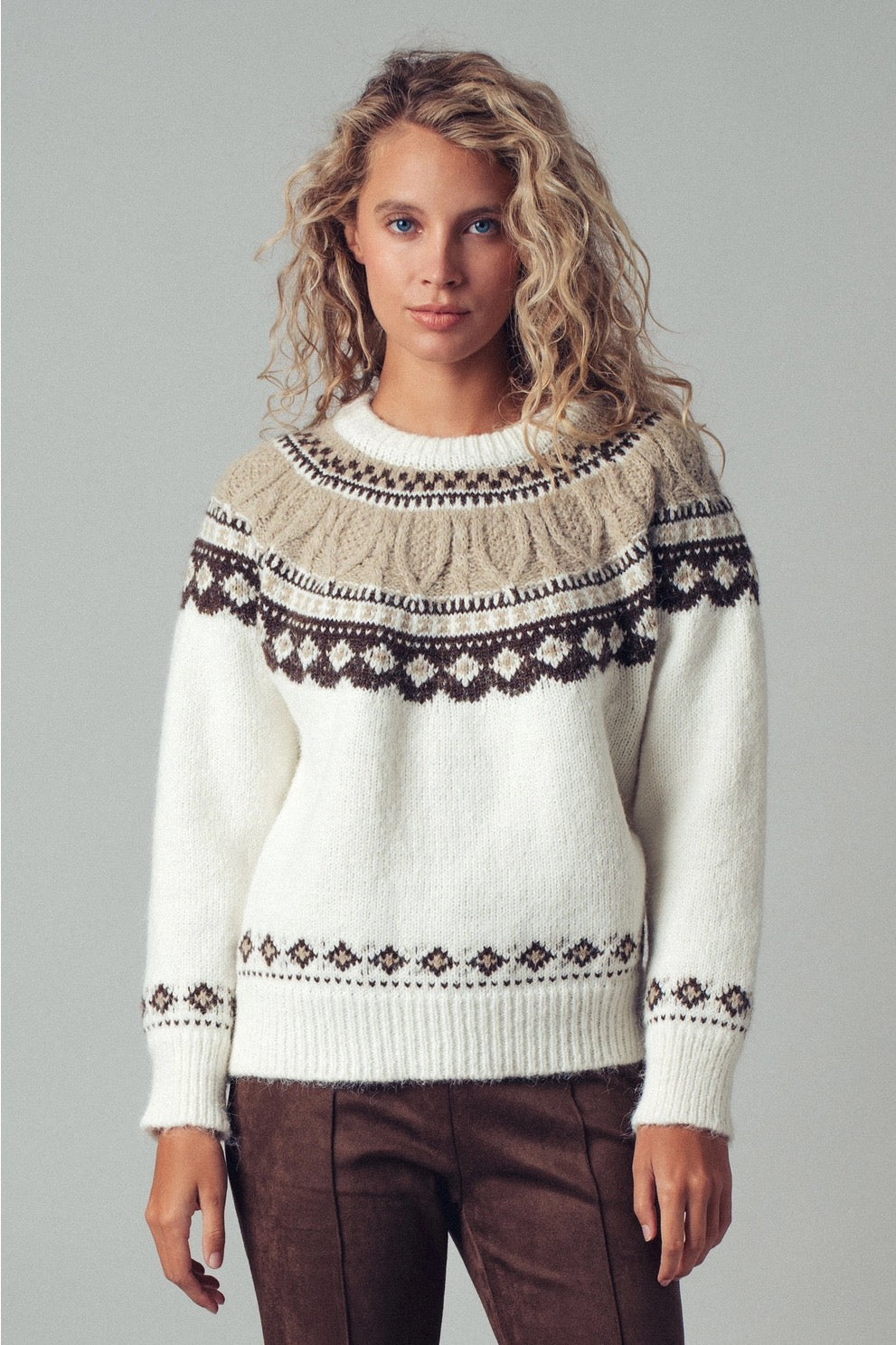 The Zermatt Sweater blends cozy warmth with timeless alpine style. A fair isle knit with ribbed edges and a relaxed crew neckline—perfect for layering or wearing solo. Effortless, chic, and designed to be your go-to winter essential.