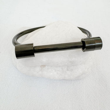 A bold statement in black stainless steel, the Evora Bangle Bracelet features a sleek cylindrical bar detail that adds modern edge to any look. Wear it solo for a minimalist touch or stack it for maximum impact.
