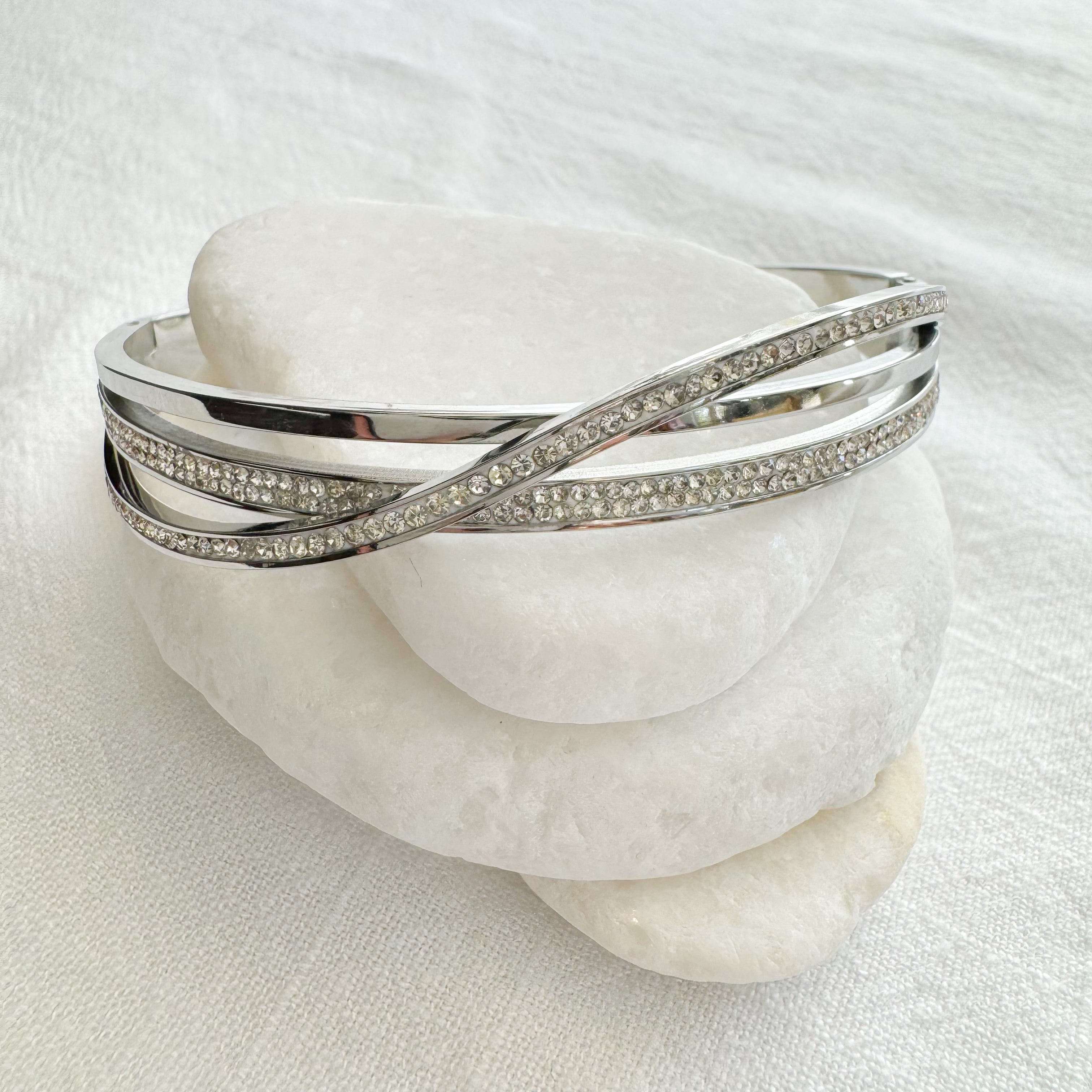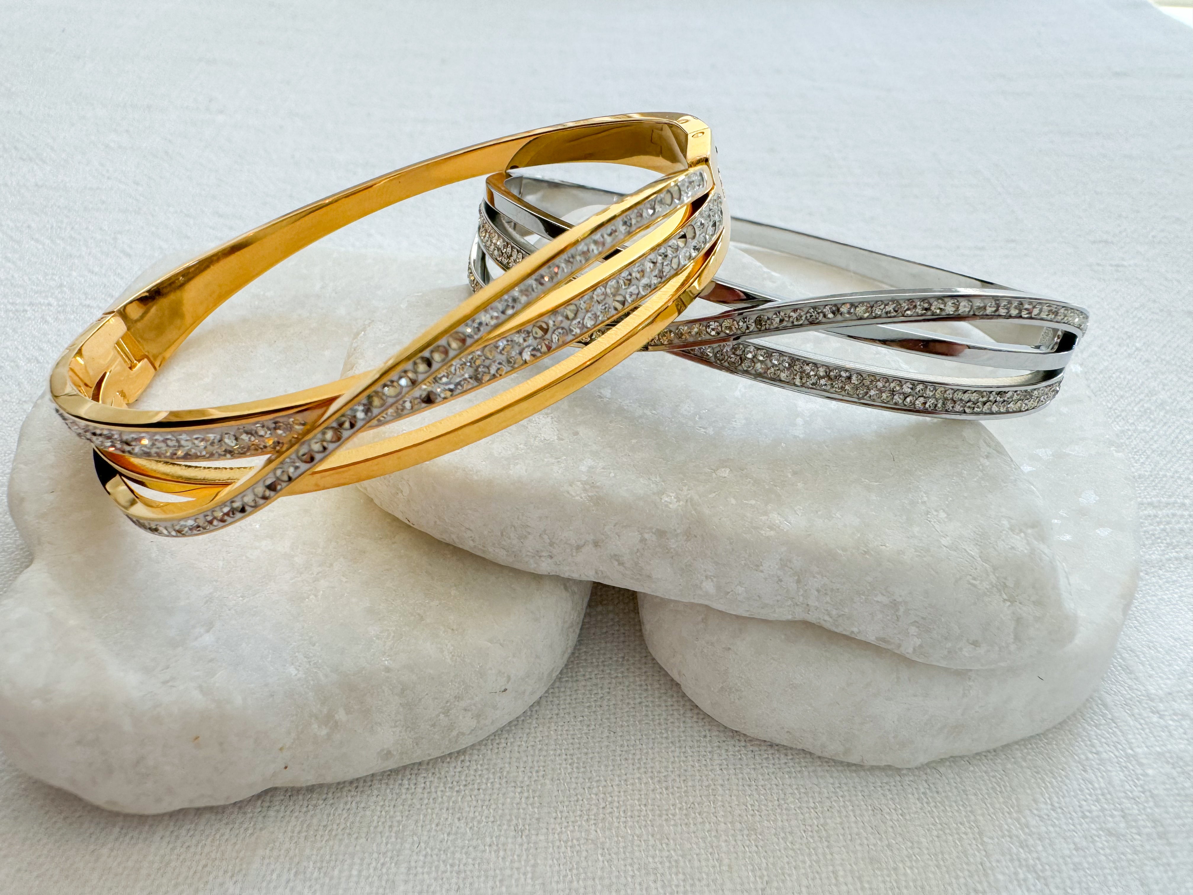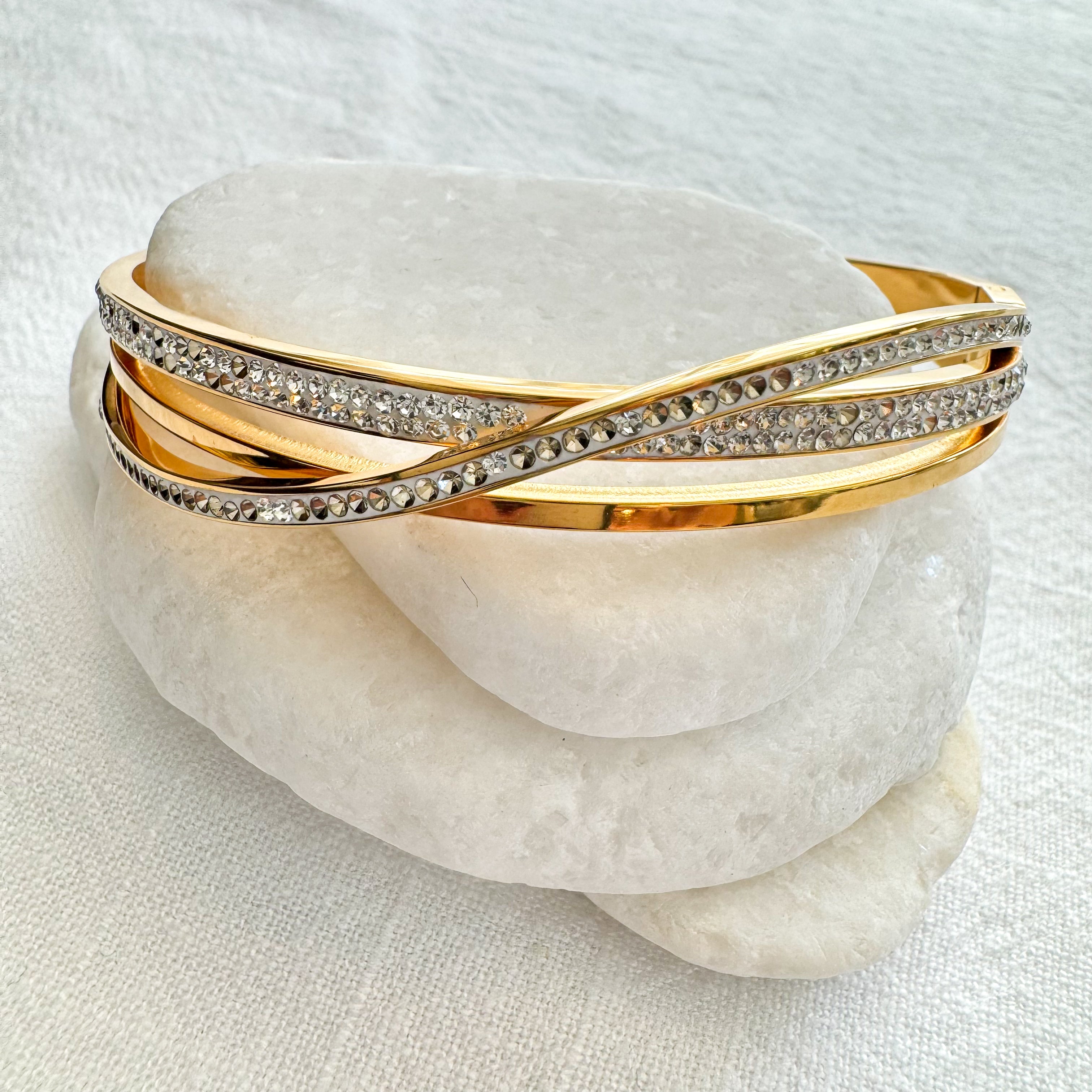 The Juliet Bracelet is a stylish piece featuring a gold-plated finish and sparkling cubic zirconia stones. The bangle design incorporates a twist with inlaid crystal zircon accents, adding elegance to any outfit.
