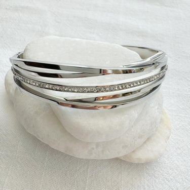 A sleek silver bangle that elevates any look. The Murcia Bracelet features layered stainless-steel bands with a hint of sparkle—perfect for adding effortless polish to both everyday outfits and evening style.