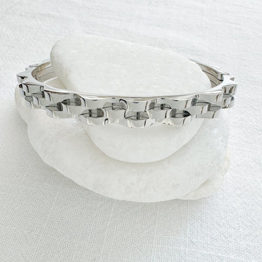 The Saylor Bangle Bracelet redefines minimalism with a structured, chain-inspired design. Crafted in polished stainless steel, this piece adds a subtle statement and modern edge to your everyday look.