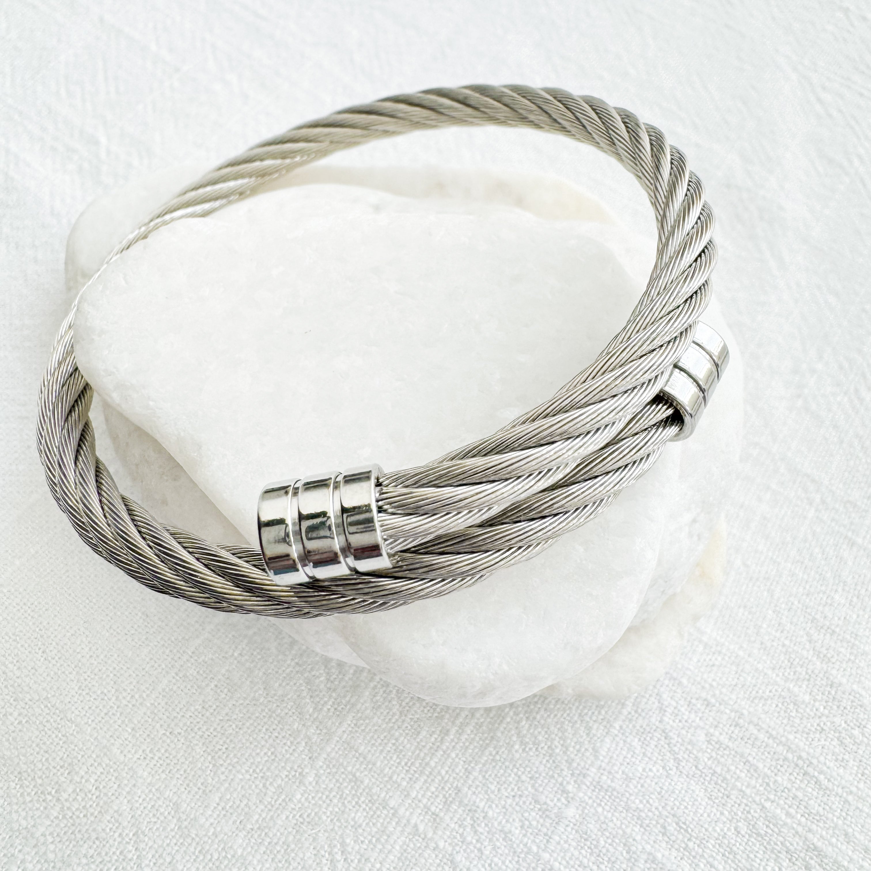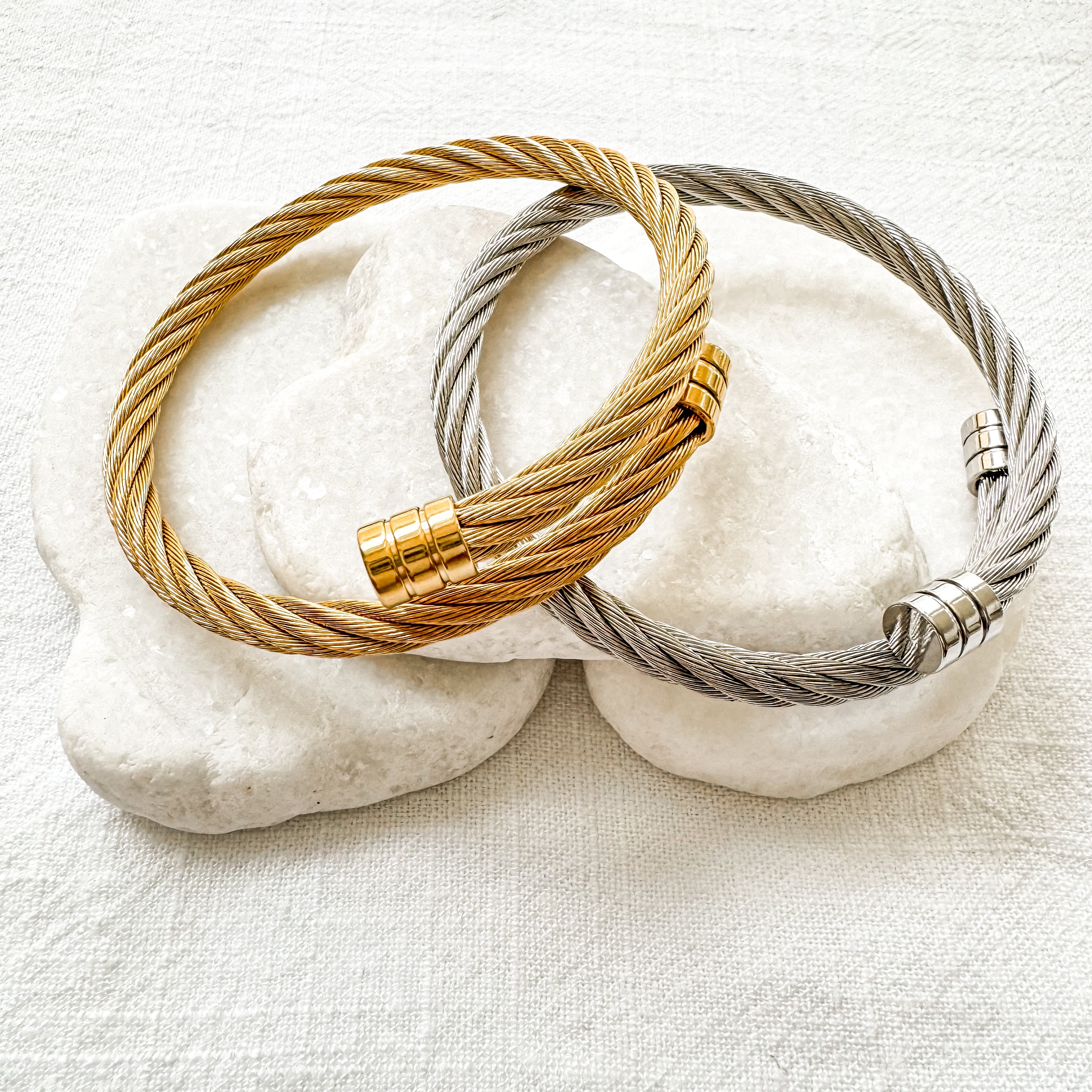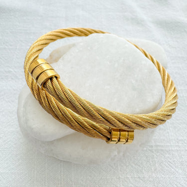 The Sibila Bangle Bracelet blends timeless sophistication with a modern twist. Its rope-inspired design and polished finish make it the perfect accent — elegant solo or layered for added texture and shine.