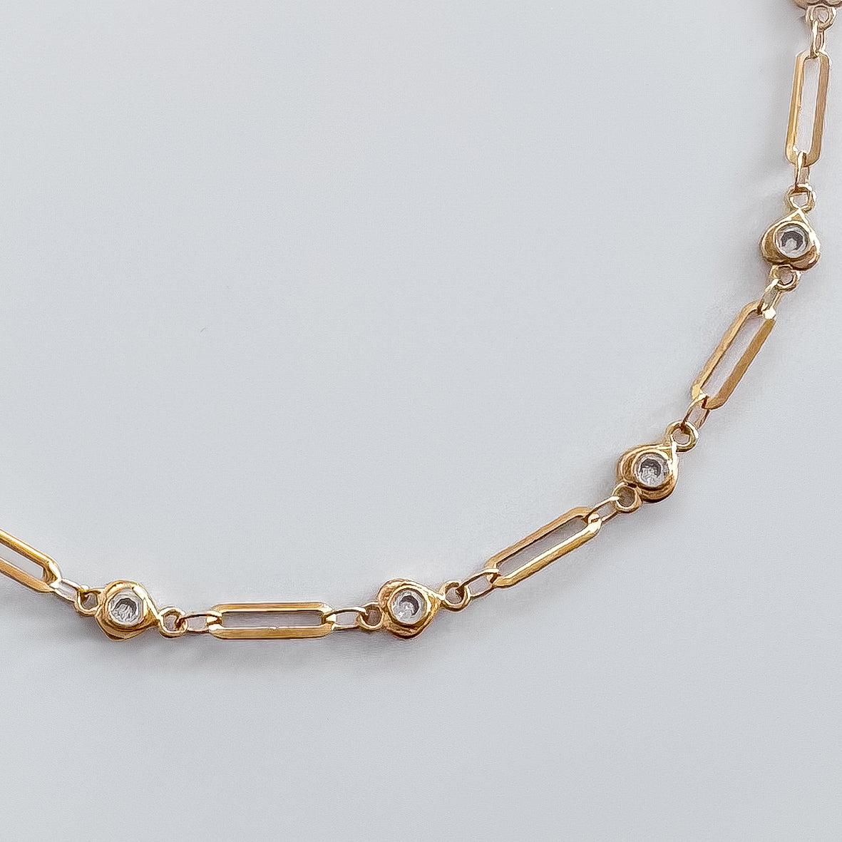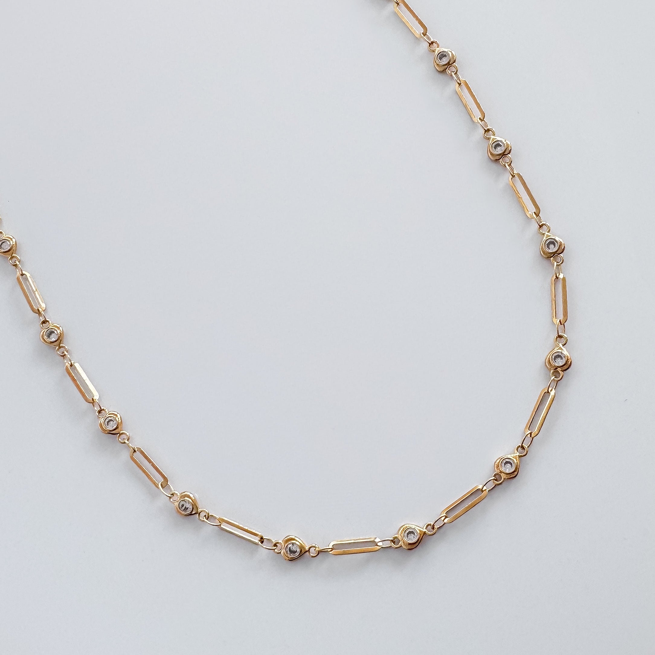 The Aimme Necklace is a gold-filled chain with modern elongated links and delicate crystal details. Perfect alone or paired with dainty gold jewelry to add to the stack!
