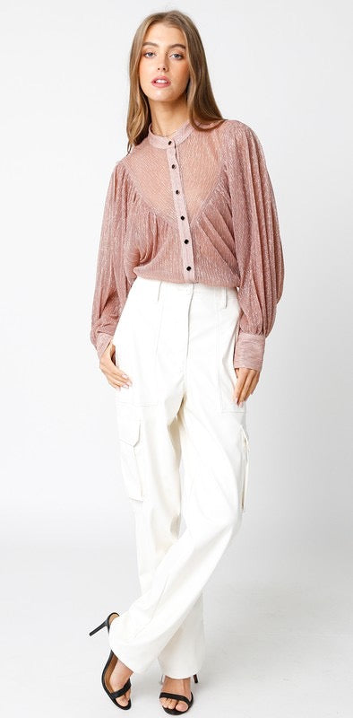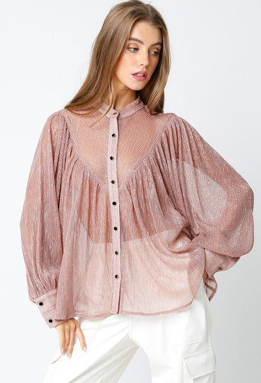 Shimmer and sophistication in one piece — the Selene Metallic Blouse is crafted in a pleated sheer fabric with a luminous finish. Designed with a relaxed fit, button-down front, and flowy sleeves, it’s the blouse that transitions effortlessly from chic daytime to elevated night-out. Layer it over a bralette or camisole for a bold statement or tuck it into high-waisted pants for a polished look.