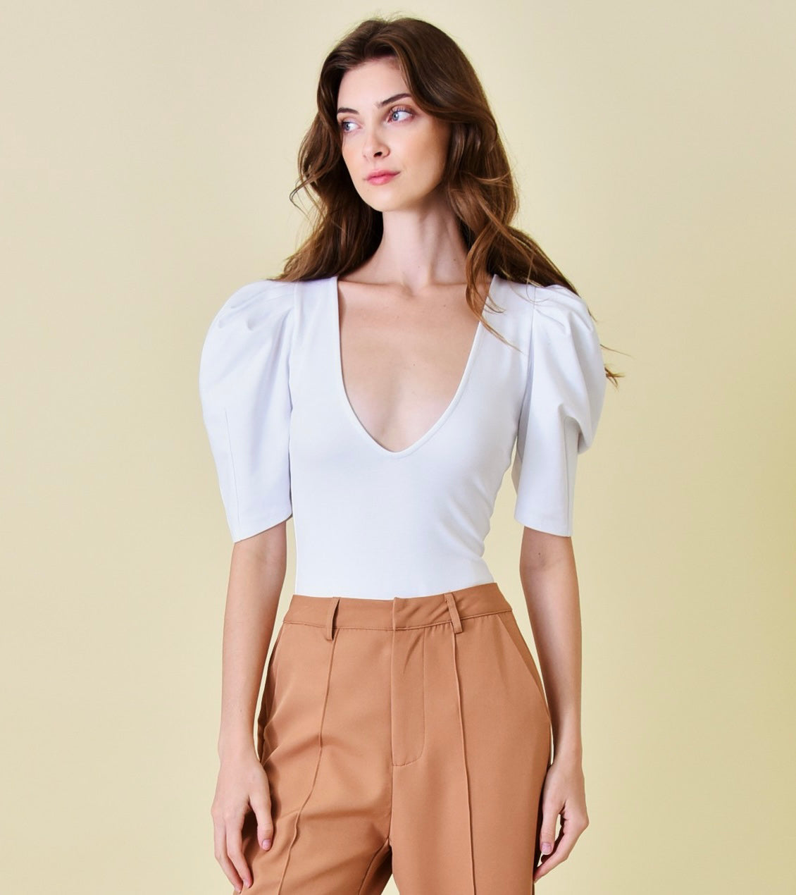 The Azura Bodysuit blends timeless elegance with modern design. Featuring structured puff sleeves and a flattering deep neckline, this sleek white bodysuit elevates every outfit — from daytime chic to evening polish.