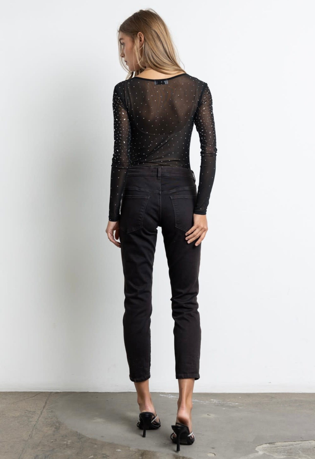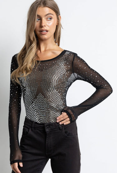 Make every night unforgettable with the Vegas Bodysuit — a dazzling mix of shimmer and sophistication. Sheer mesh, crystal details, and a curve-hugging silhouette for the bold and confident.