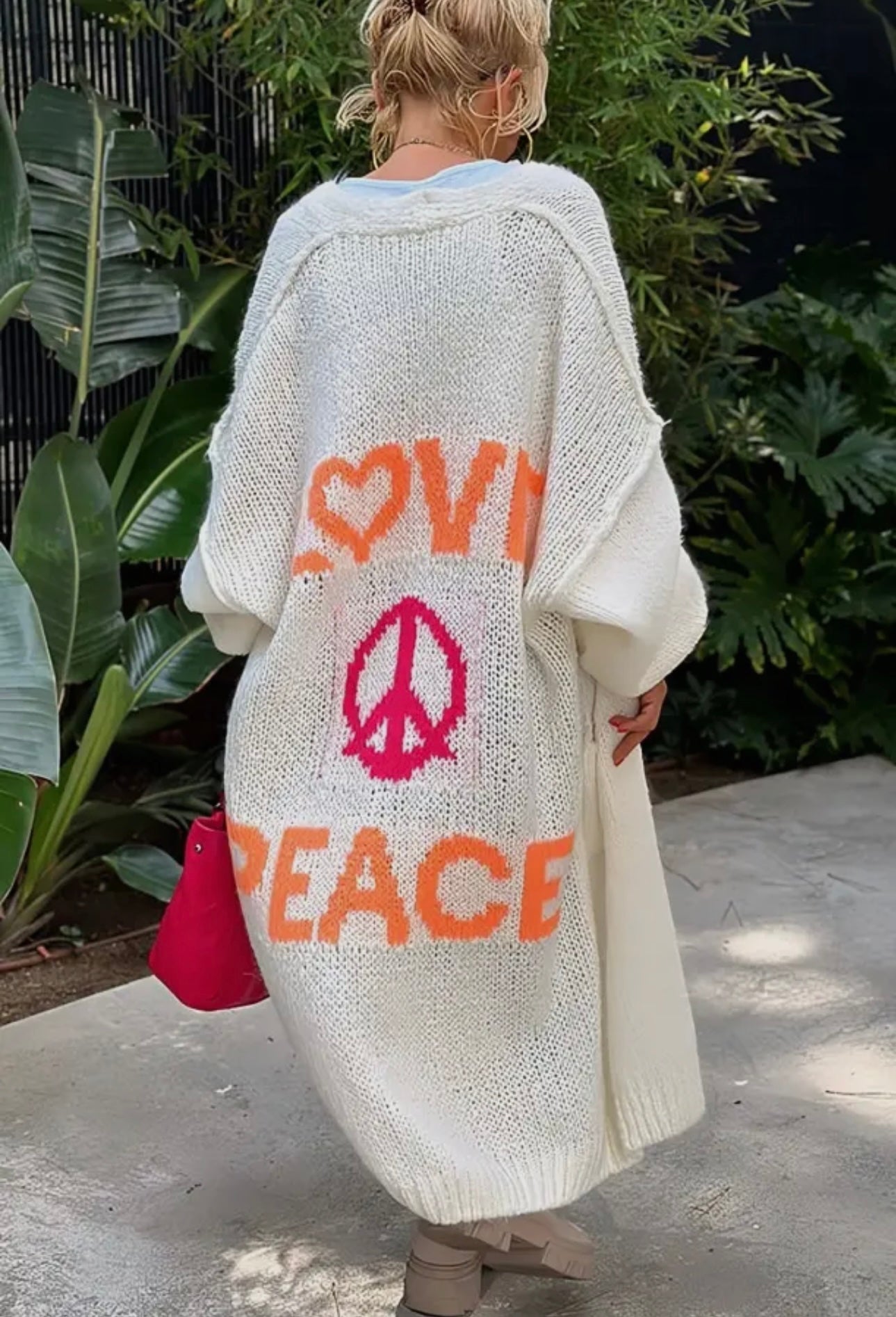 The Love & Peace Sweater Cardigan wraps you in cozy warmth and effortless positivity. Featuring bold LOVE and PEACE graphics in vibrant orange and pink, this oversized knit brings playful charm and laid-back luxury to your everyday style.