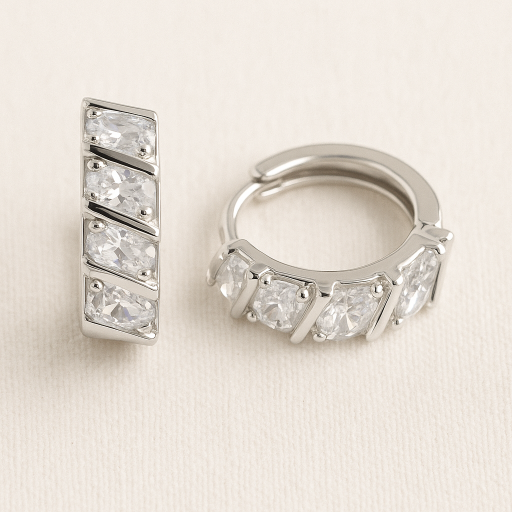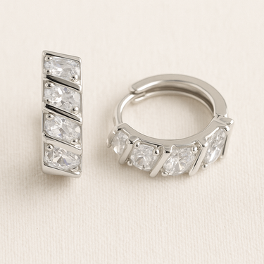 Cillian Huggie Earrings feature geometric faceted stones set on a sleek polished huggie. A refined sparkle designed for everyday wear.