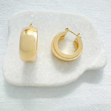 Sculptural gold hoops with a bold, polished silhouette. Lightweight, hypoallergenic, and designed to add effortless statement shine to any look.