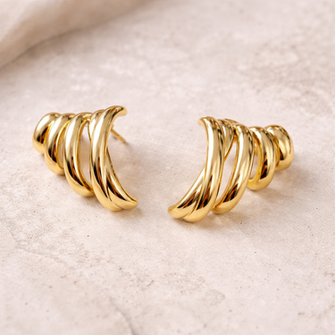 Sculptural gold stud earrings with a fluid, curved silhouette. Designed to hug the ear with a bold yet refined shape, they add instant polish to minimalist looks and elevated everyday styling.