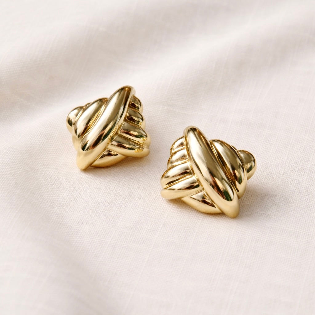 Sculptural gold-tone stud earrings inspired by organic forms. Bold yet refined, their fluid design adds a modern statement to both everyday looks and elevated outfit.