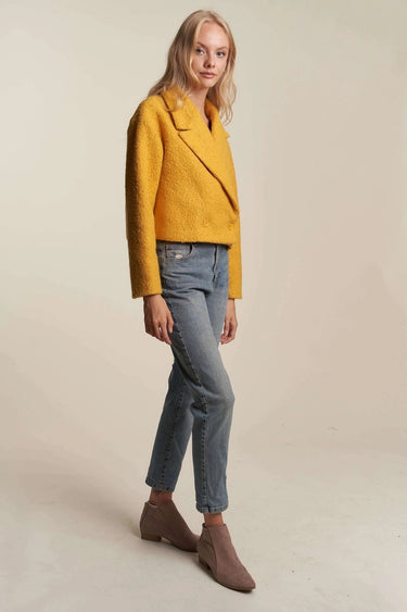 Wrap yourself in warmth and style with the Golden Hour Cropped Coat. Its bold mustard tone and soft textured fabric make it the ultimate statement piece for cooler days. Featuring a relaxed cropped fit with a double-breasted front, this coat layers effortlessly over denim, dresses, or tailored pants. Both cozy and chic, it’s your go-to for elevating everyday looks.