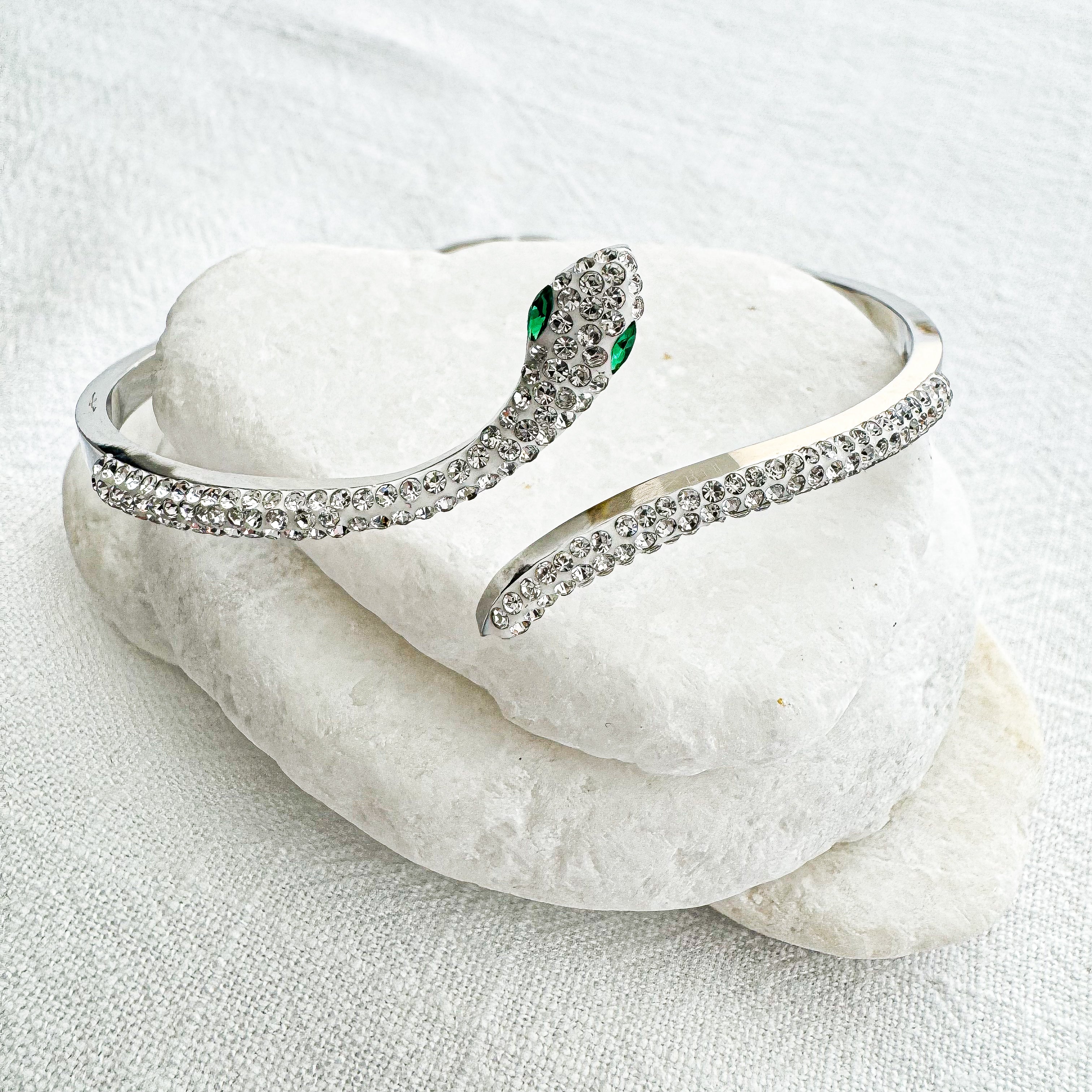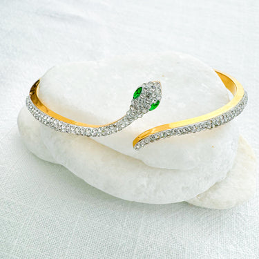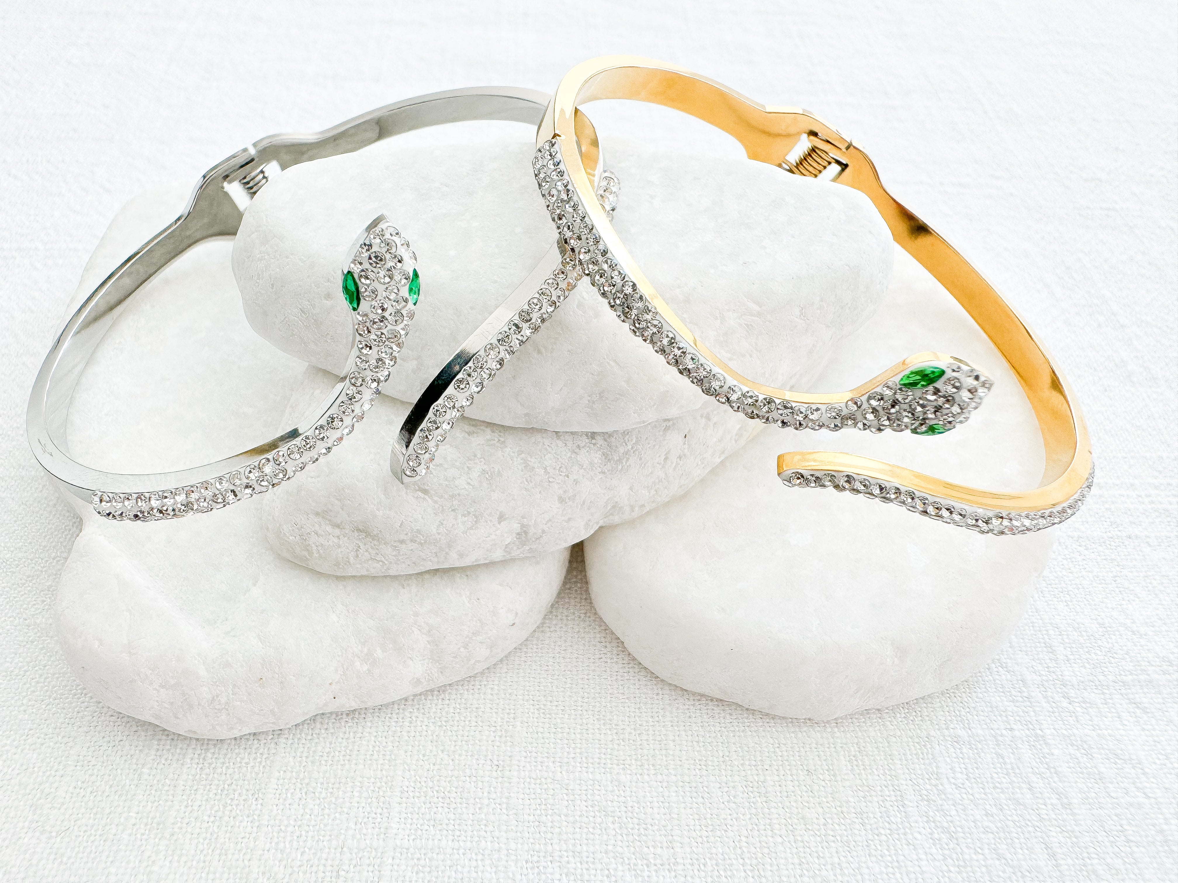 Sleek, sculptural, and striking — the Mich Cuff Bracelet curves gracefully around the wrist with crystal details and a subtle serpent-inspired design. A bold yet elegant piece that adds instant allure to any look.