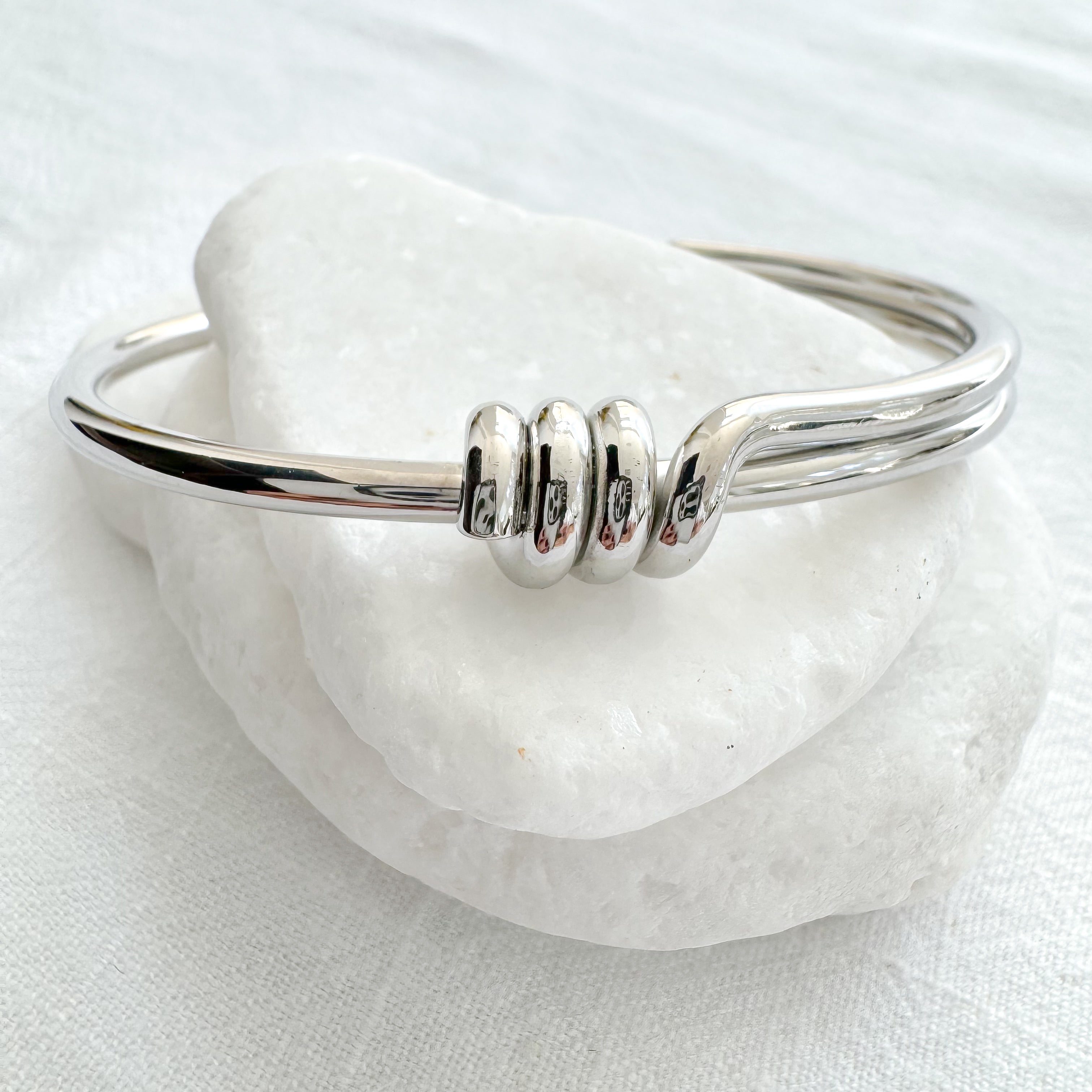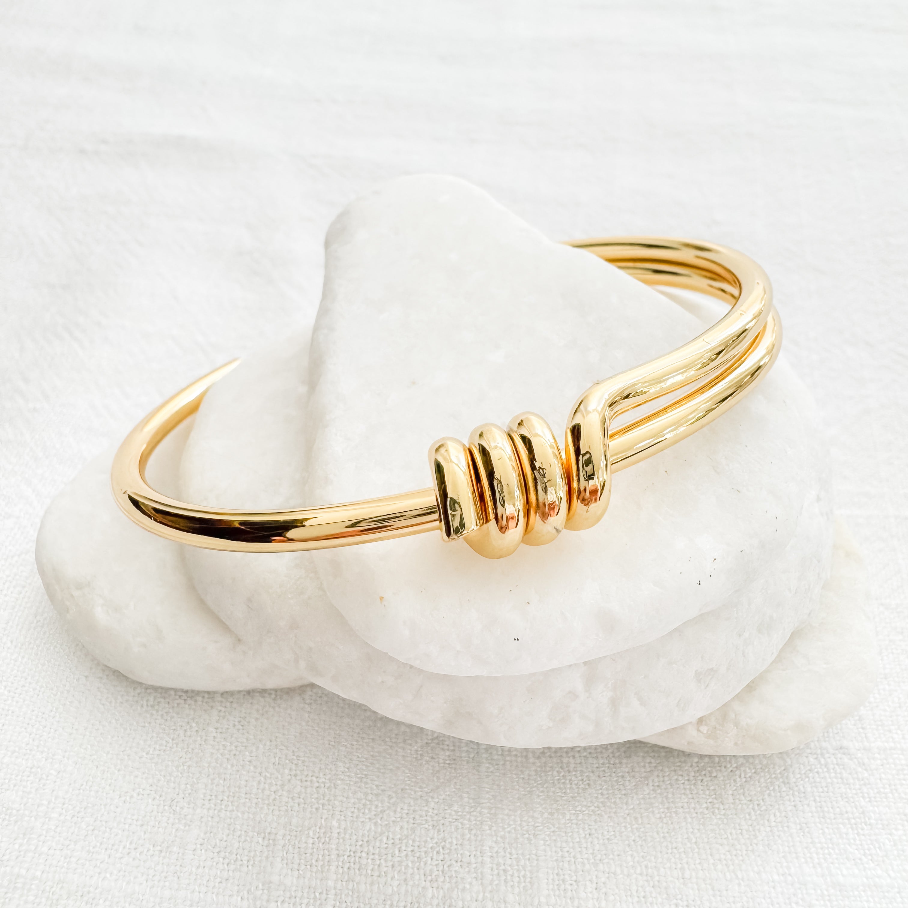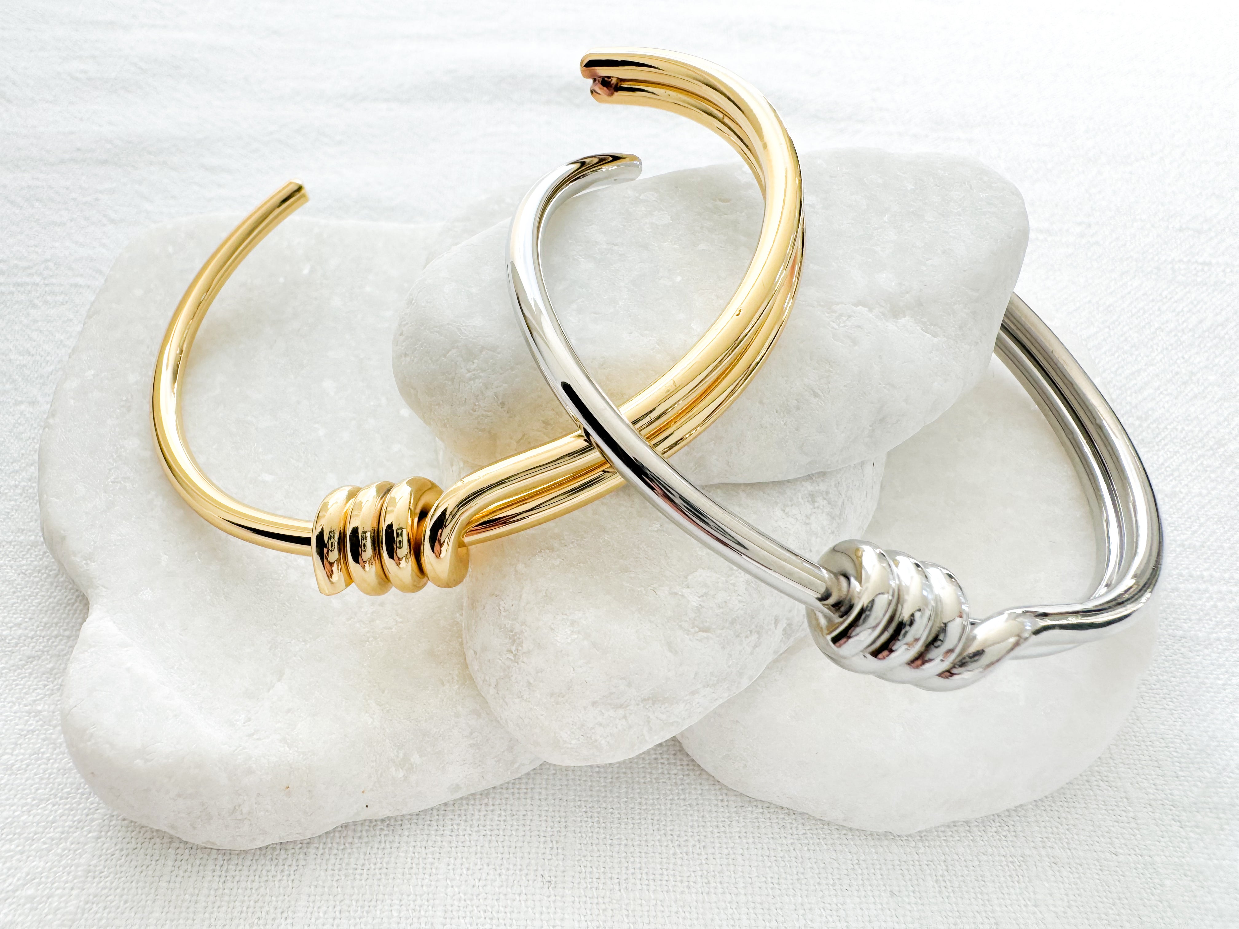 Minimal and refined — the Sabino Cuff Bracelet features a polished silhouette accented with sculptural rings at the center. Perfectly balanced between simplicity and shine, it’s the ideal everyday statement.