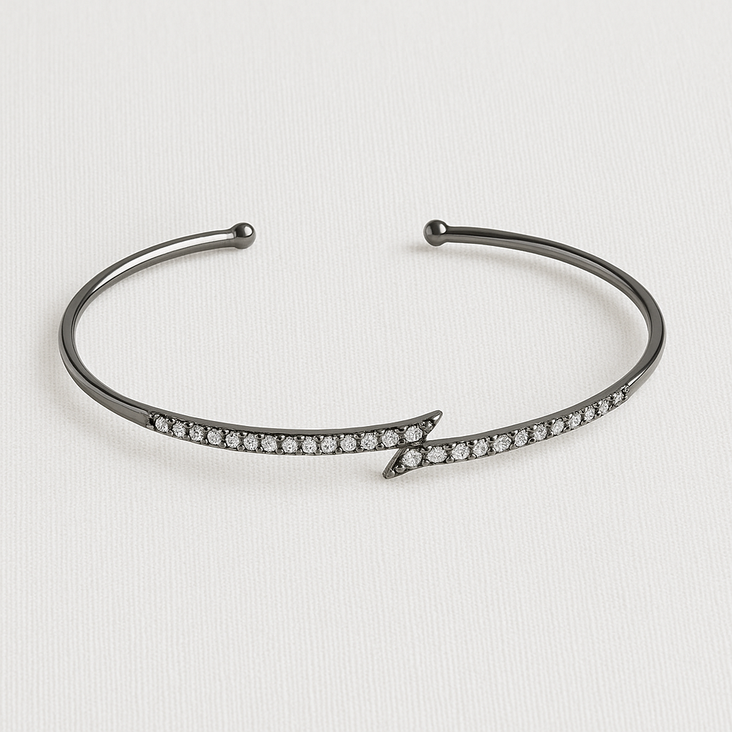 Delicate and refined — this slim arrow cuff shines with mirror-like gunmetal and subtle white zirconia sparkle. Lightweight, modern, and effortlessly elegant — perfect for stacking or wearing solo for understated glamour.