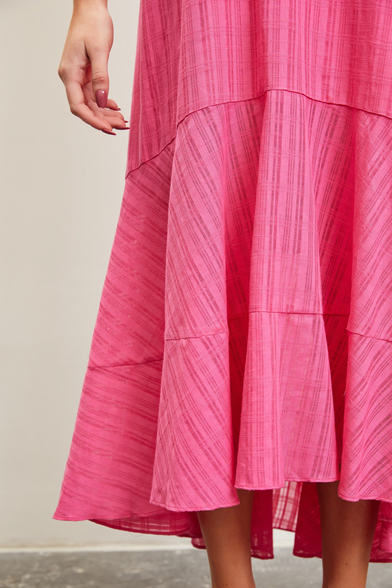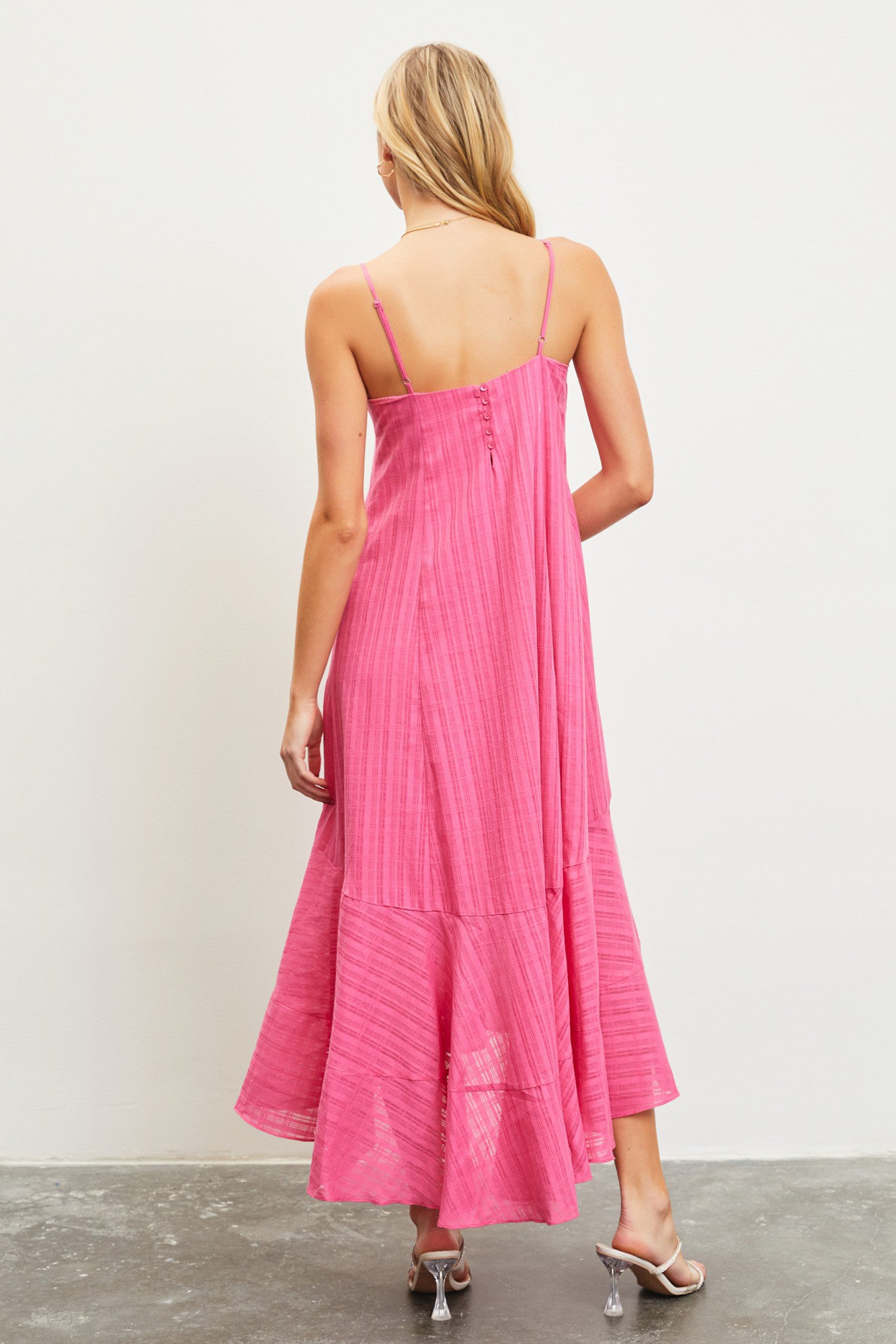 Add a touch of sunshine with the Ainsley Pink Midi Dress — a flowy, lightweight piece with spaghetti straps and a ruffled hem. Breezy, effortless, and full of color.