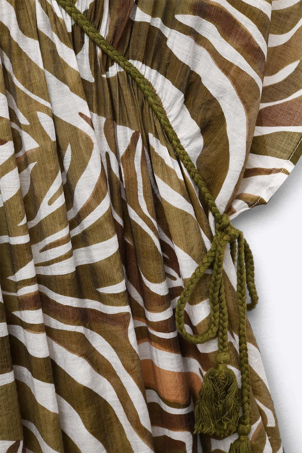 An effortlessly romantic maxi dress designed with a fluid silhouette and an organic, zebra-inspired print. Featuring a soft V-neckline, adjustable drawstring waist, and airy movement throughout, this piece balances comfort and elegance with ease. Perfect for warm days, layered looks, or barefoot moments that call for understated drama.