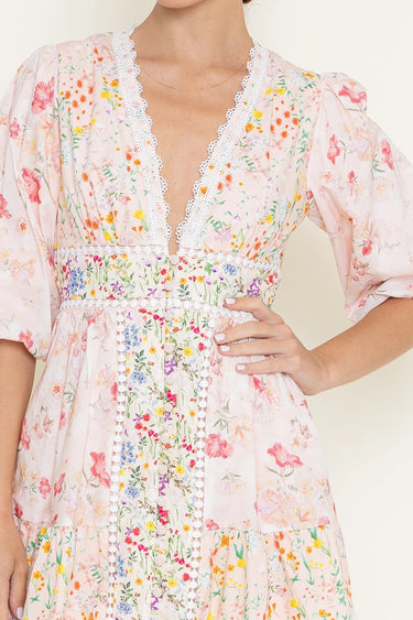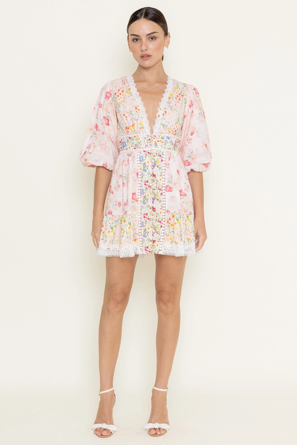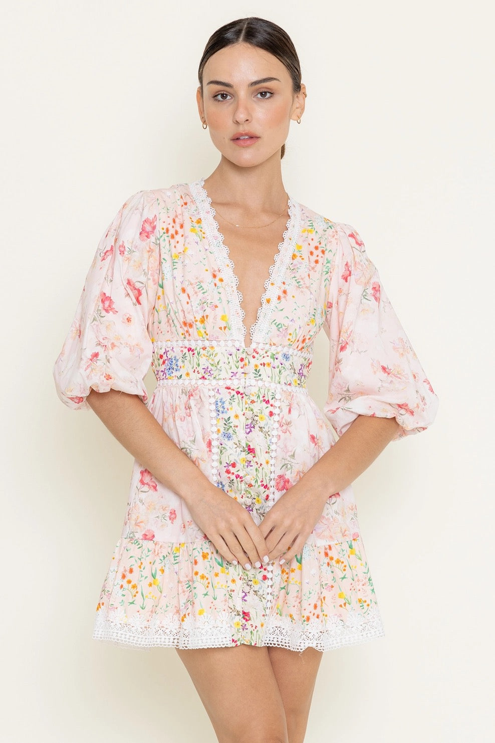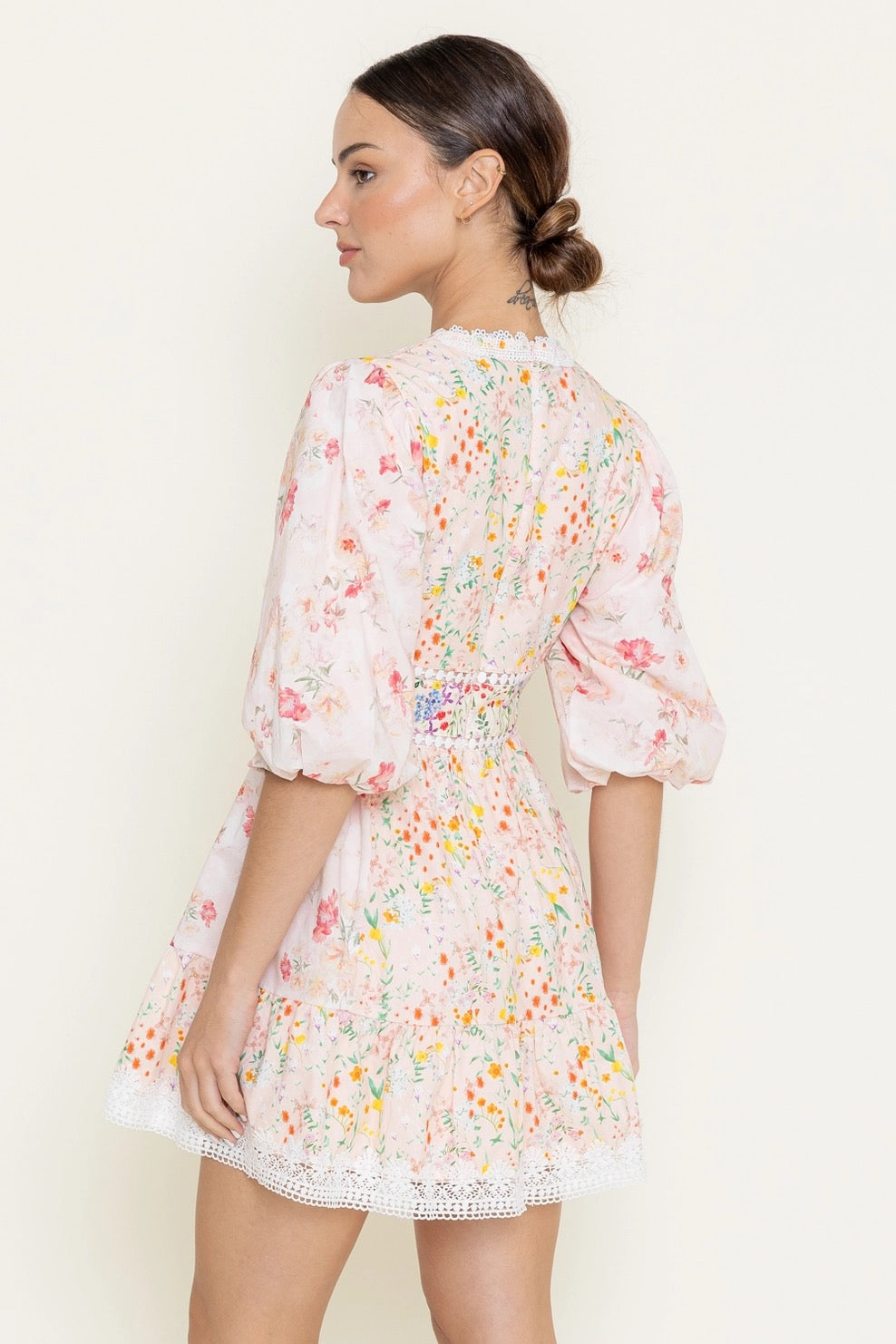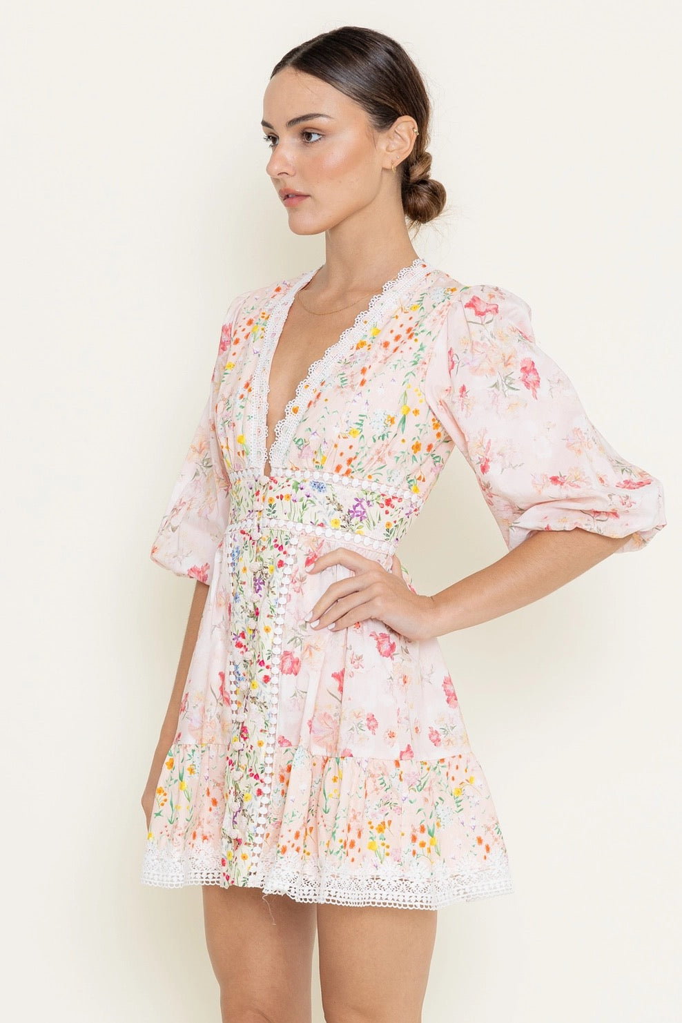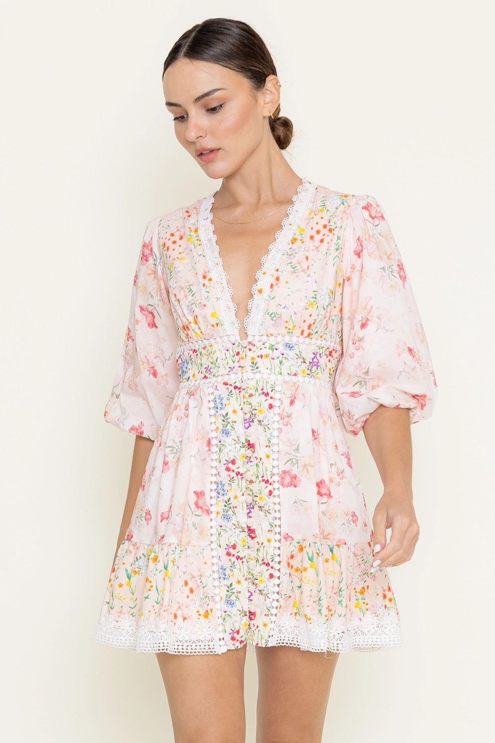 The Floral Mini Dress brings a romantic bohemian charm with its soft cotton fabric, crochet lace trim, and vibrant floral print. A flattering deep V-neckline and puff sleeves make it perfect for brunches, garden parties, or summer days under the sun.