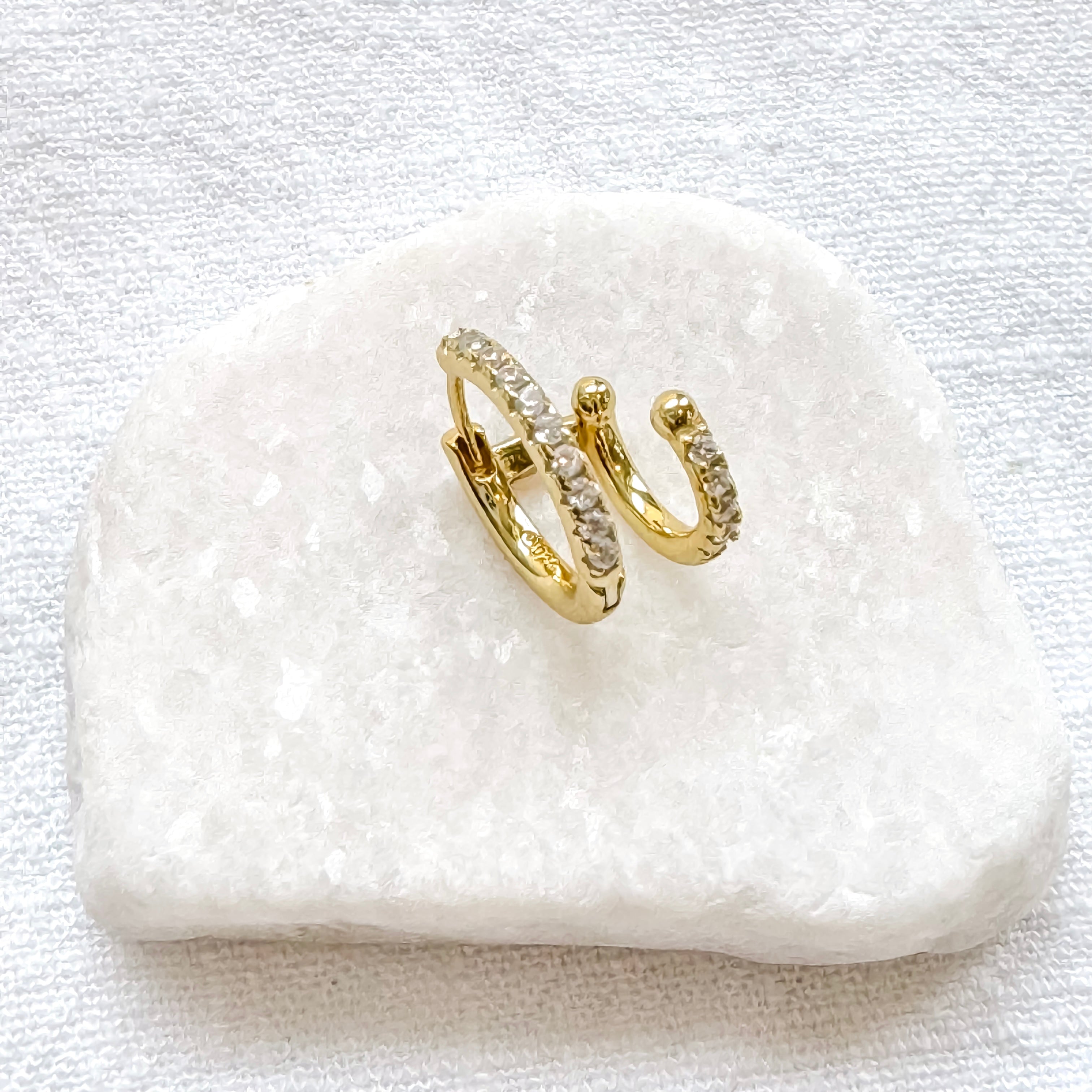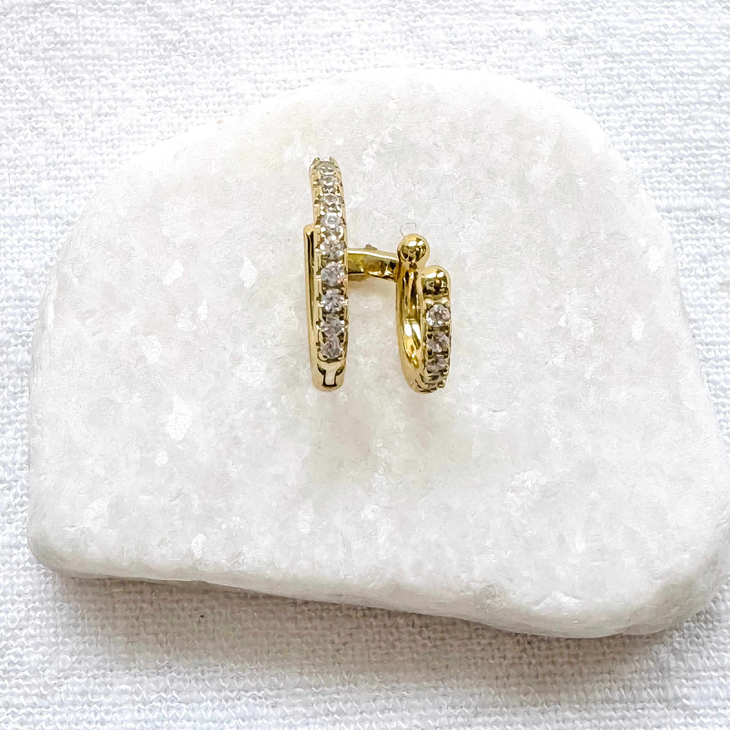 A bold two-in-one: a sparkling zirconia huggie paired with a sleek cuff. Pierced + cuff design for the perfect stacked look—effortless shine in one piece.