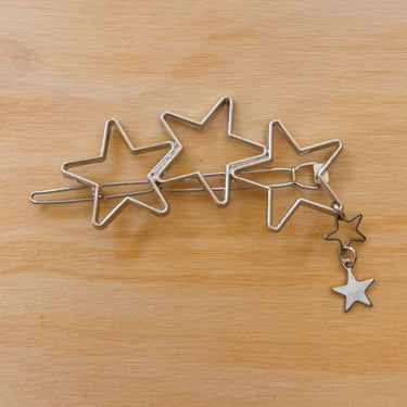 Add a touch of whimsy to your hairstyle with the Tivoli Hair Clip, featuring a charming 3-star design paired with a smaller 2-star pendant. This playful accessory effortlessly brightens your look while keeping your hair stylishly in place. Perfect for adding a little sparkle to any day!