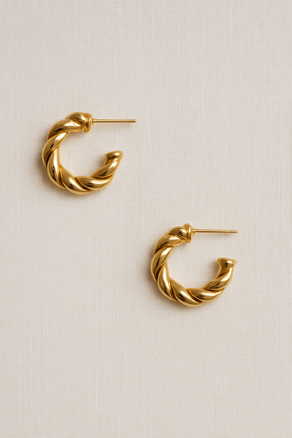 Twisted and timeless — these gold-plated hoops bring effortless elegance with a sculptural shine. Lightweight, versatile, and perfect for every occasion.