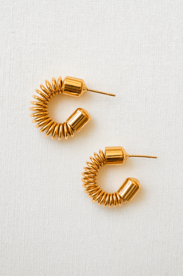 Sculptural and bold — the Cicely Hoop Earrings feature a unique coiled design with modern edge. Crafted in gold plating with a smooth, high-shine finish, they’re lightweight yet striking — perfect for both casual and dressy looks.