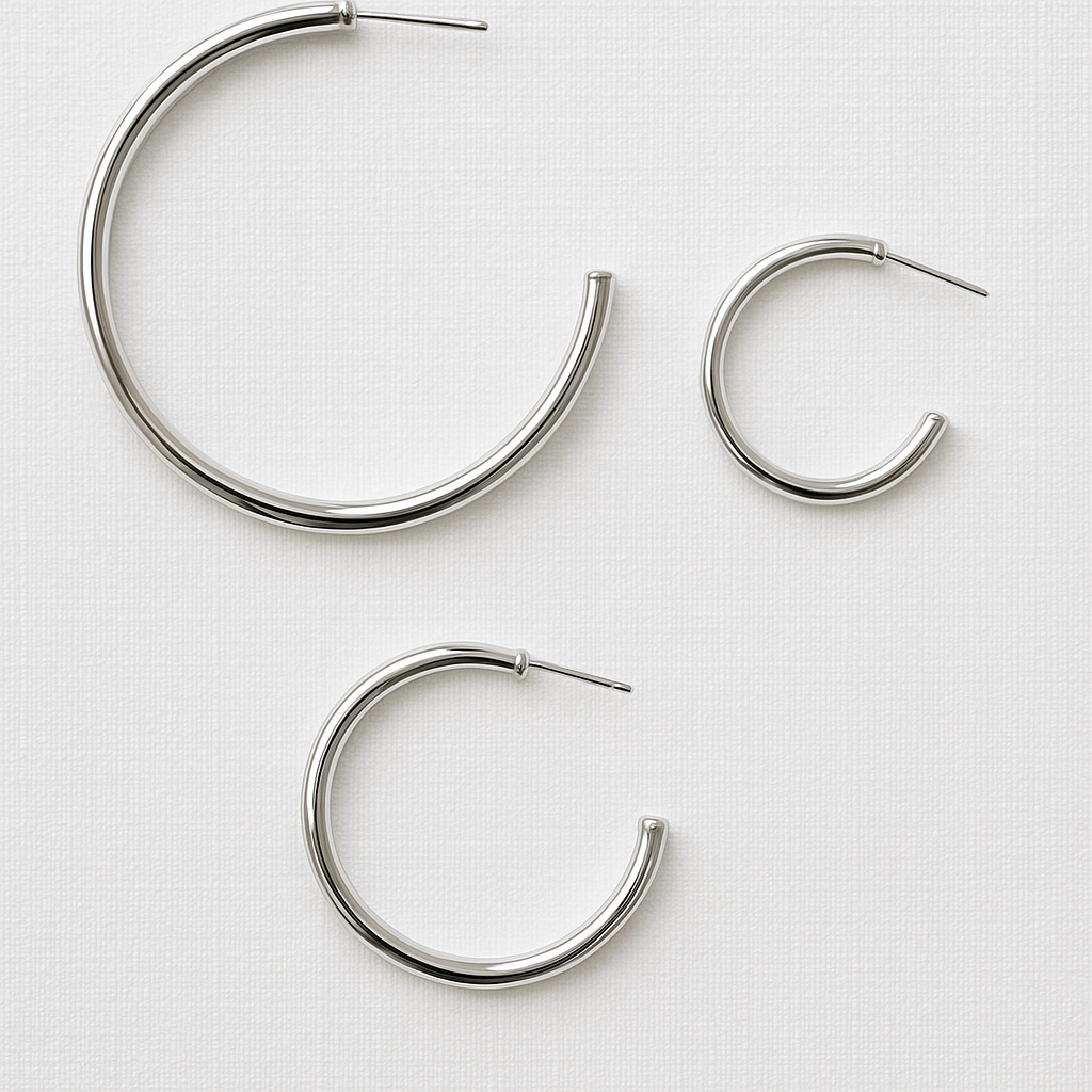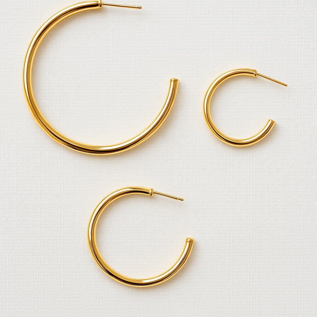 Modern gold and silver hoops with a clean, sculptural silhouette. Lightweight, hypoallergenic, and designed for timeless everyday elegance.