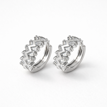Sleek huggie hoops featuring baguette-cut clear crystals in a modern zigzag setting. Polished, lightweight, and perfect for everyday wear or stacking.