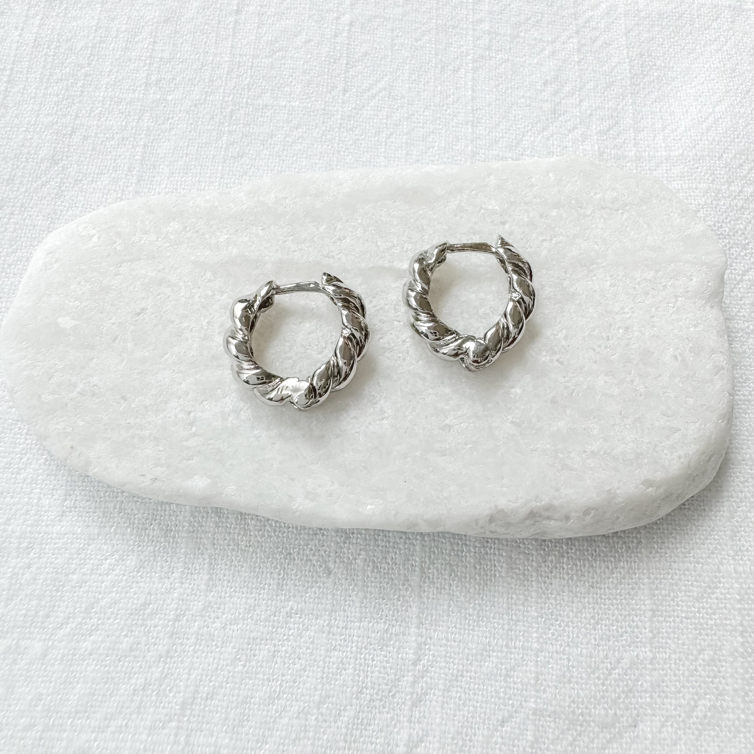 Bold and twisted, the Mechelen Silver Huggies bring sculptural shine with a rope-inspired design. A statement earring for effortless style.