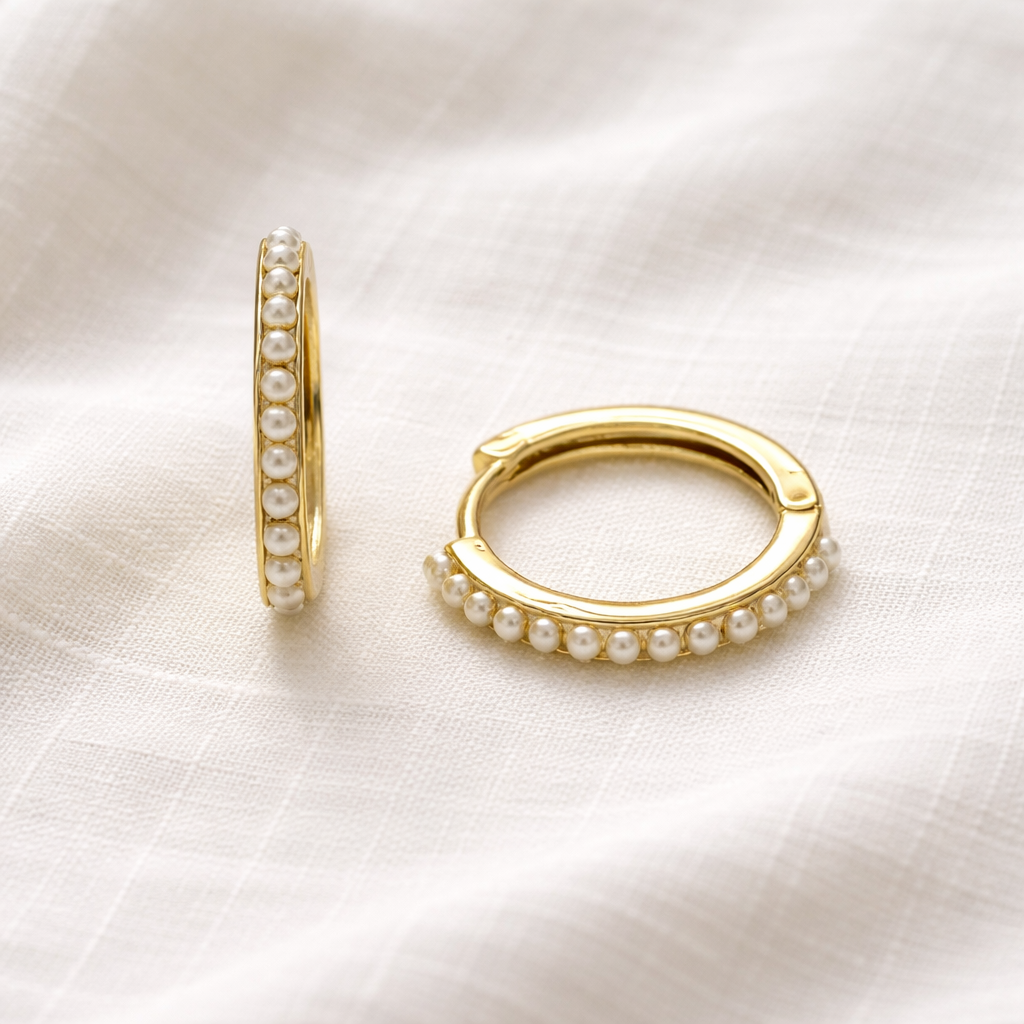 Delicate and refined, the Naia Huggie Earrings feature a slim gold huggie accented with subtle pearl detailing for a soft touch of sparkle. Designed to sit close to the ear, they are lightweight, elegant, and perfect for everyday wear.