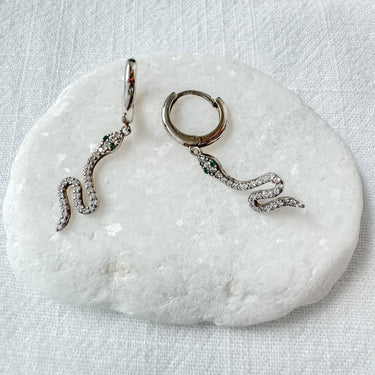 Make a striking statement — the Tournai Huggie Earrings feature sparkling snake charms with green stone eyes. Gold filled, nickel-free, and crafted for bold elegance.