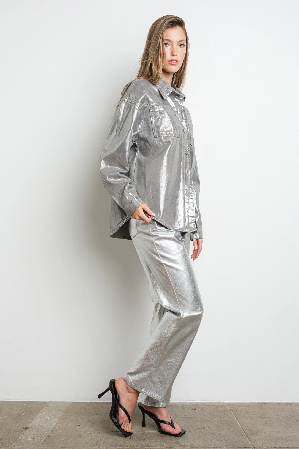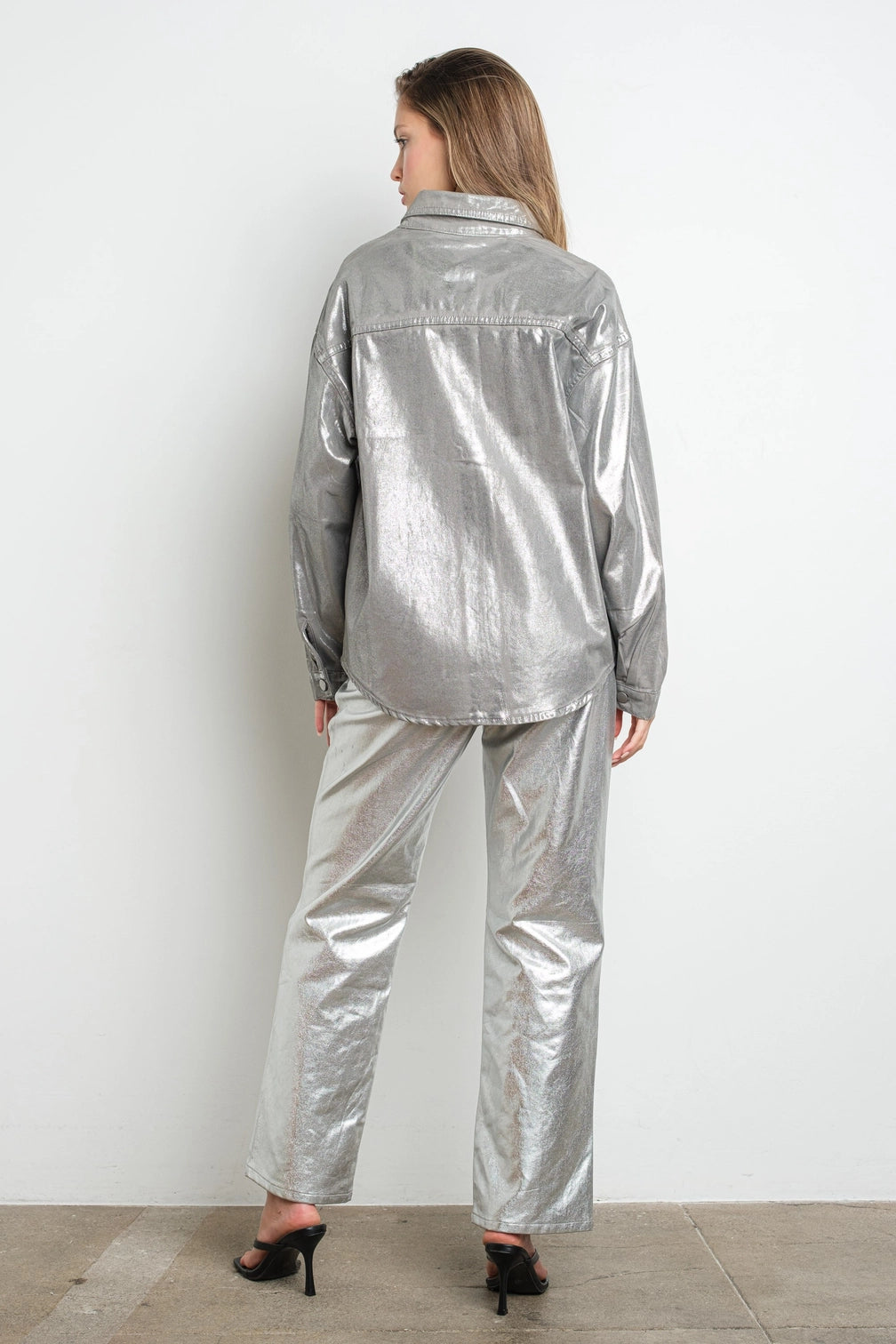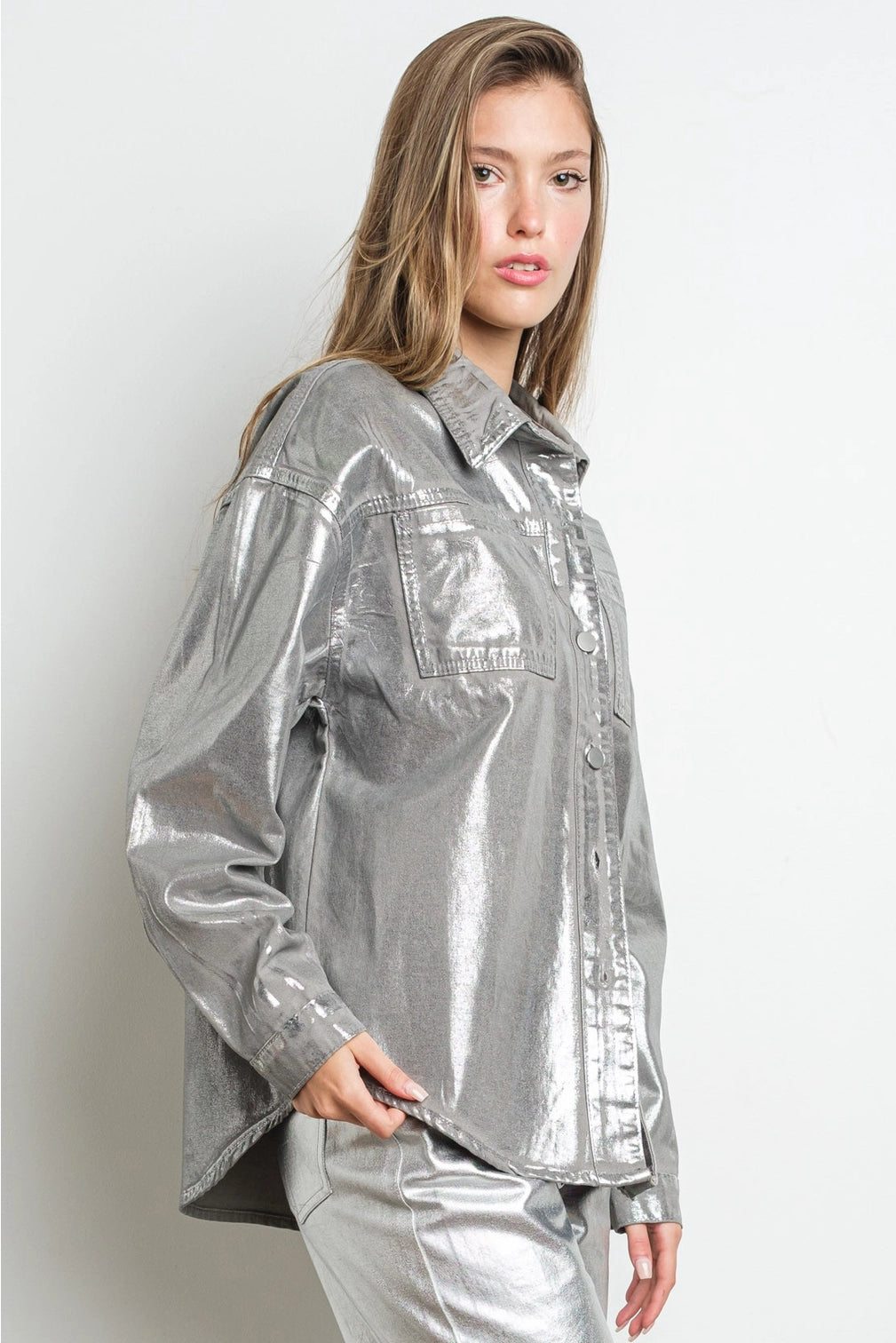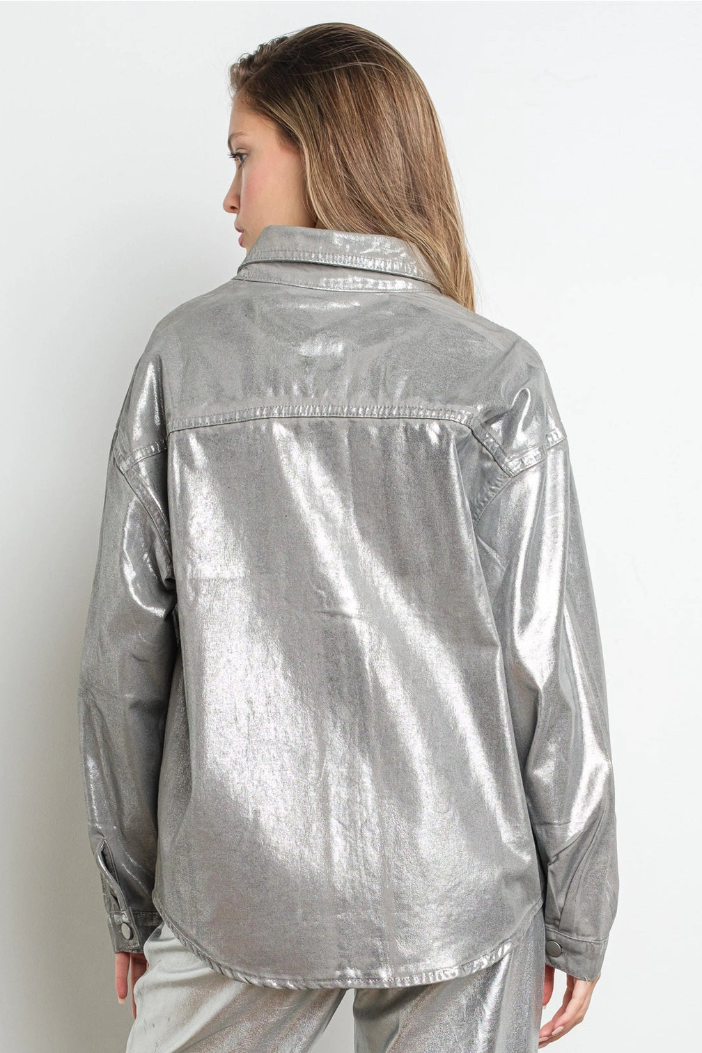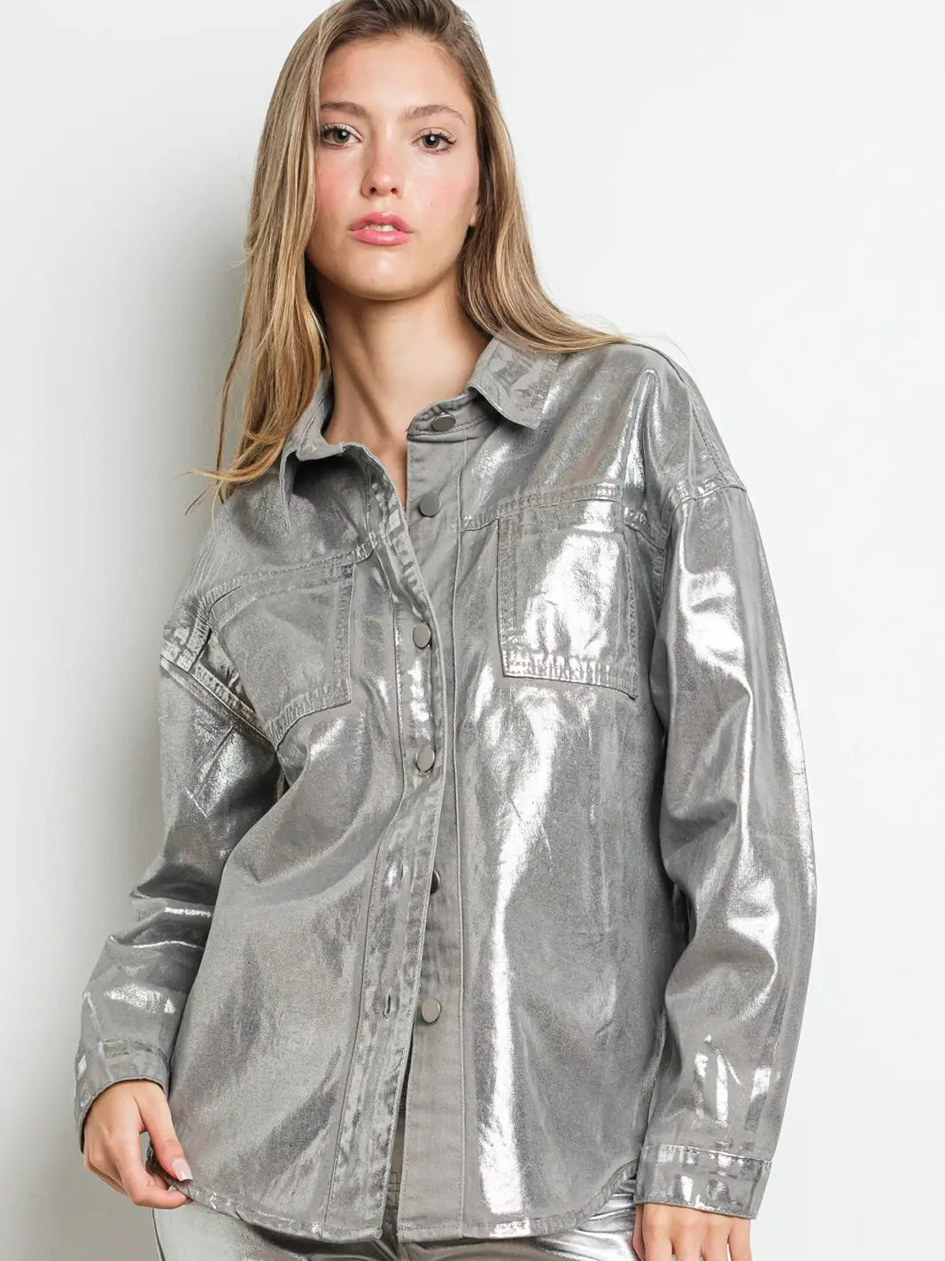 Make a statement without trying. This metallic silver jacket adds instant shine with its relaxed fit, glossy finish, and effortless cool. Lightweight, bold, and perfect for nights out or elevating everyday looks.