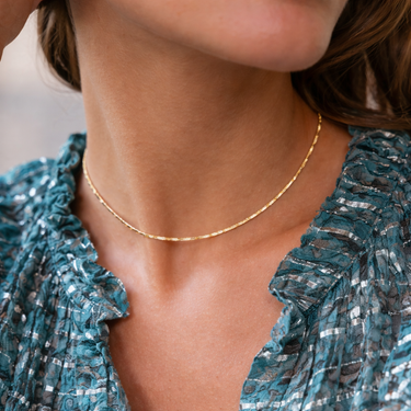 This delicate necklace is your everyday essential—refined, effortless, and endlessly versatile. Designed with ultra-fine textured links that catch the light with every movement, it sits perfectly along the collarbone for a clean, modern finish.