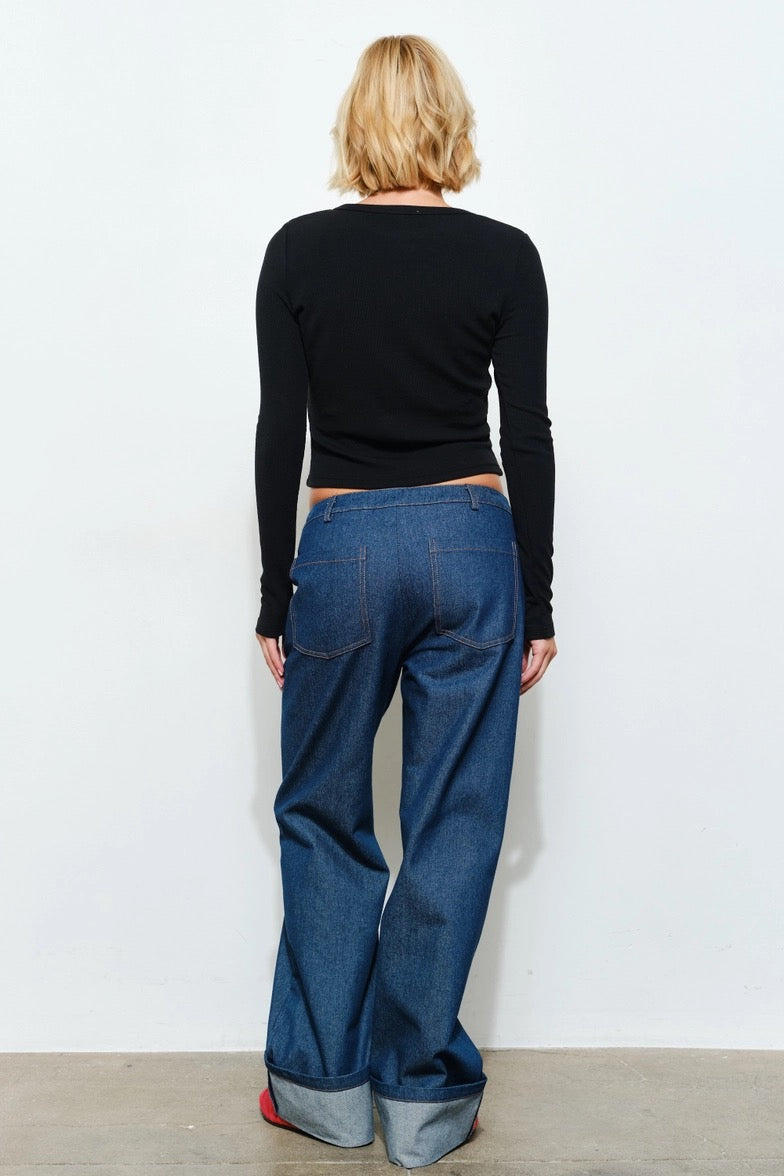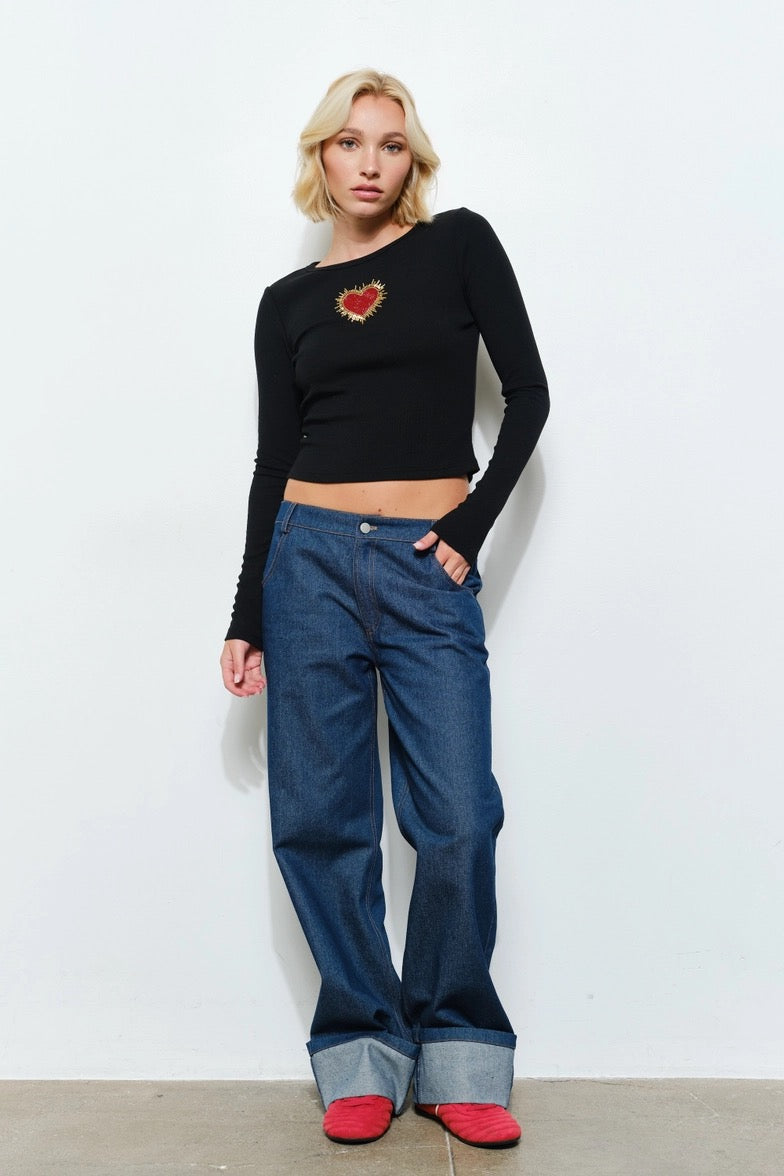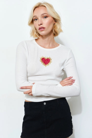 A modern classic with a playful twist. This fitted long sleeve top features a bold beaded heart detail at the center, adding just the right amount of charm to an otherwise clean, minimal silhouette. Crafted in a soft ribbed fabric, it hugs the body comfortably while elevating your everyday look.
