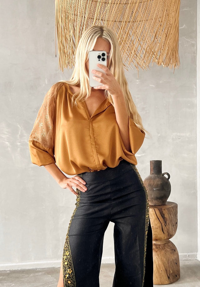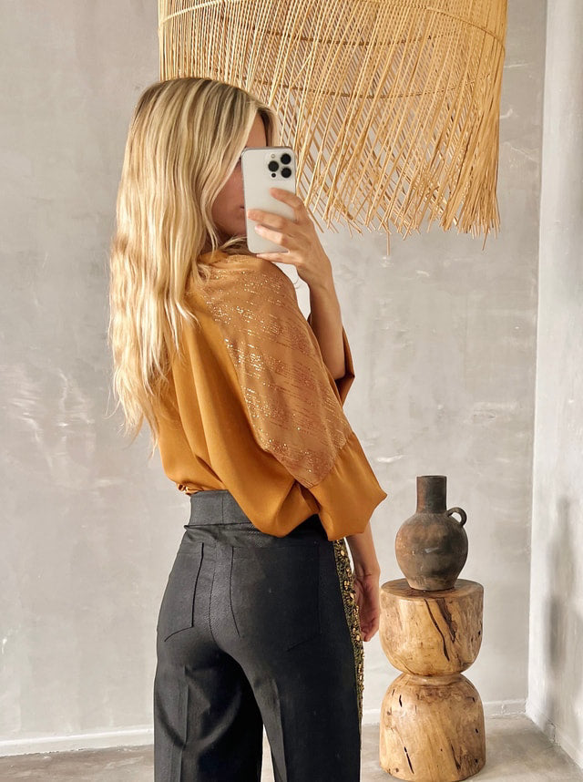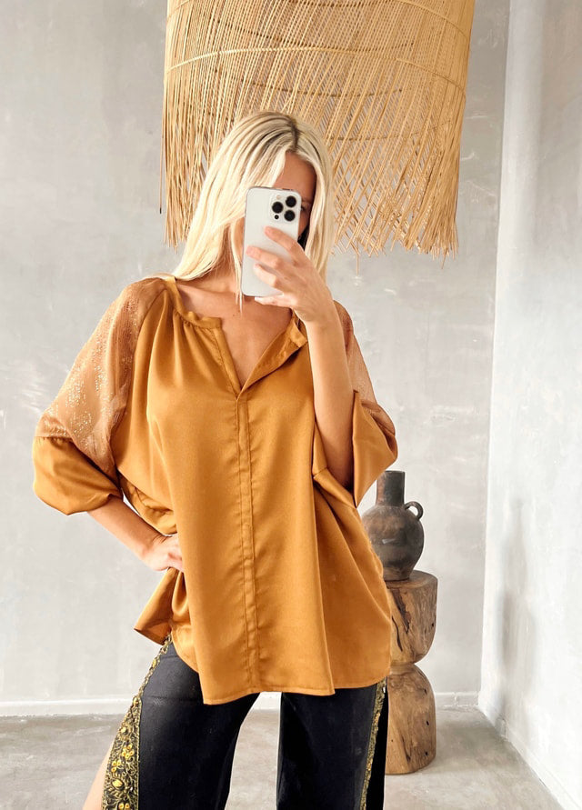 The Roam Blouse blends elegance and ease with its relaxed silhouette and rich honey hue. Designed with subtle texture and movement, it’s the perfect effortless piece for travel, brunch, or resort days.