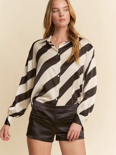 Make a statement with the Stripe City Shirt, a modern twist on classic stripes. Designed in bold black and ivory diagonal lines, this relaxed-fit blouse brings effortless sophistication to your wardrobe. Perfect for work, weekends, or a night out, it’s a versatile piece that elevates any look.