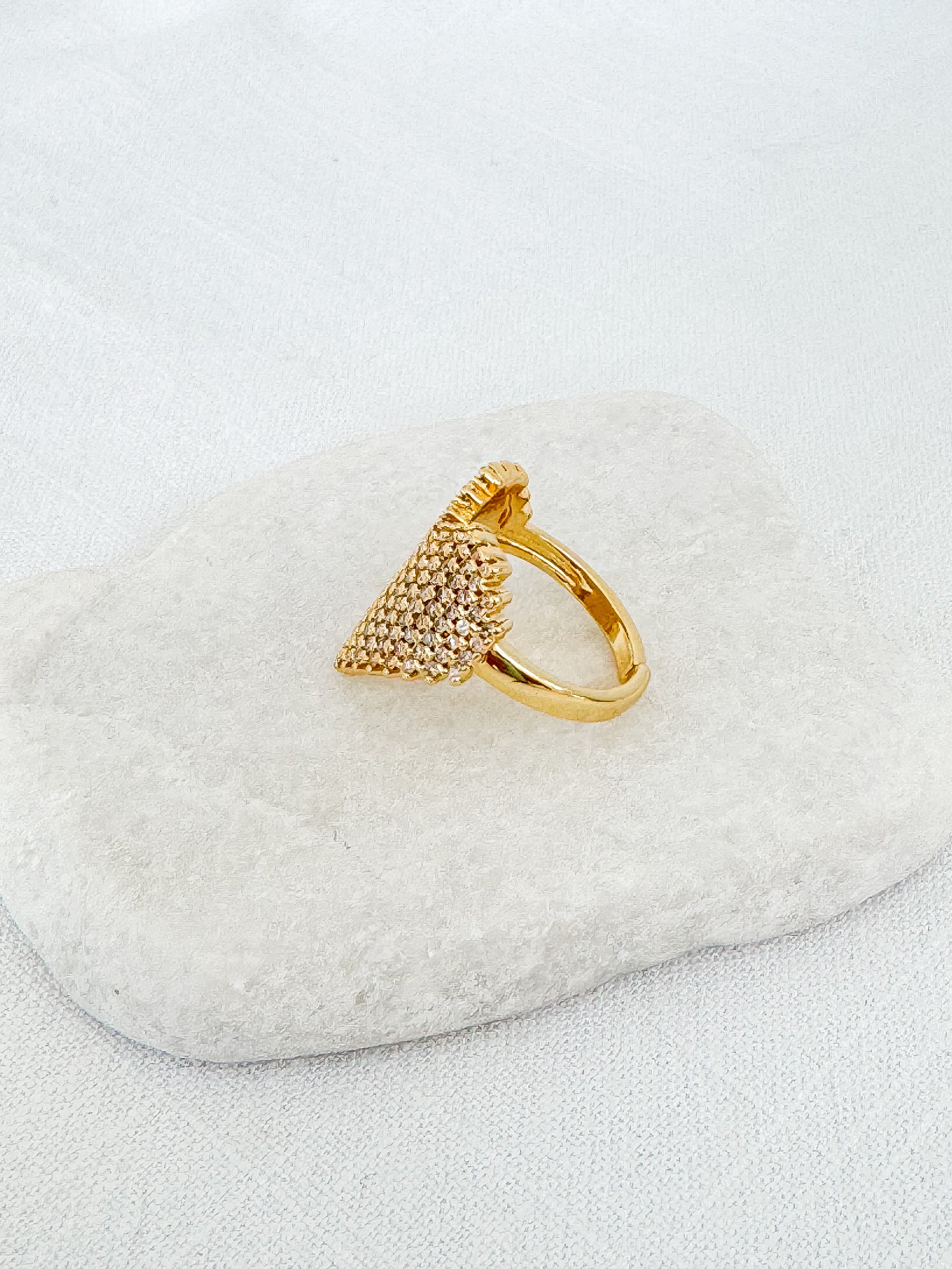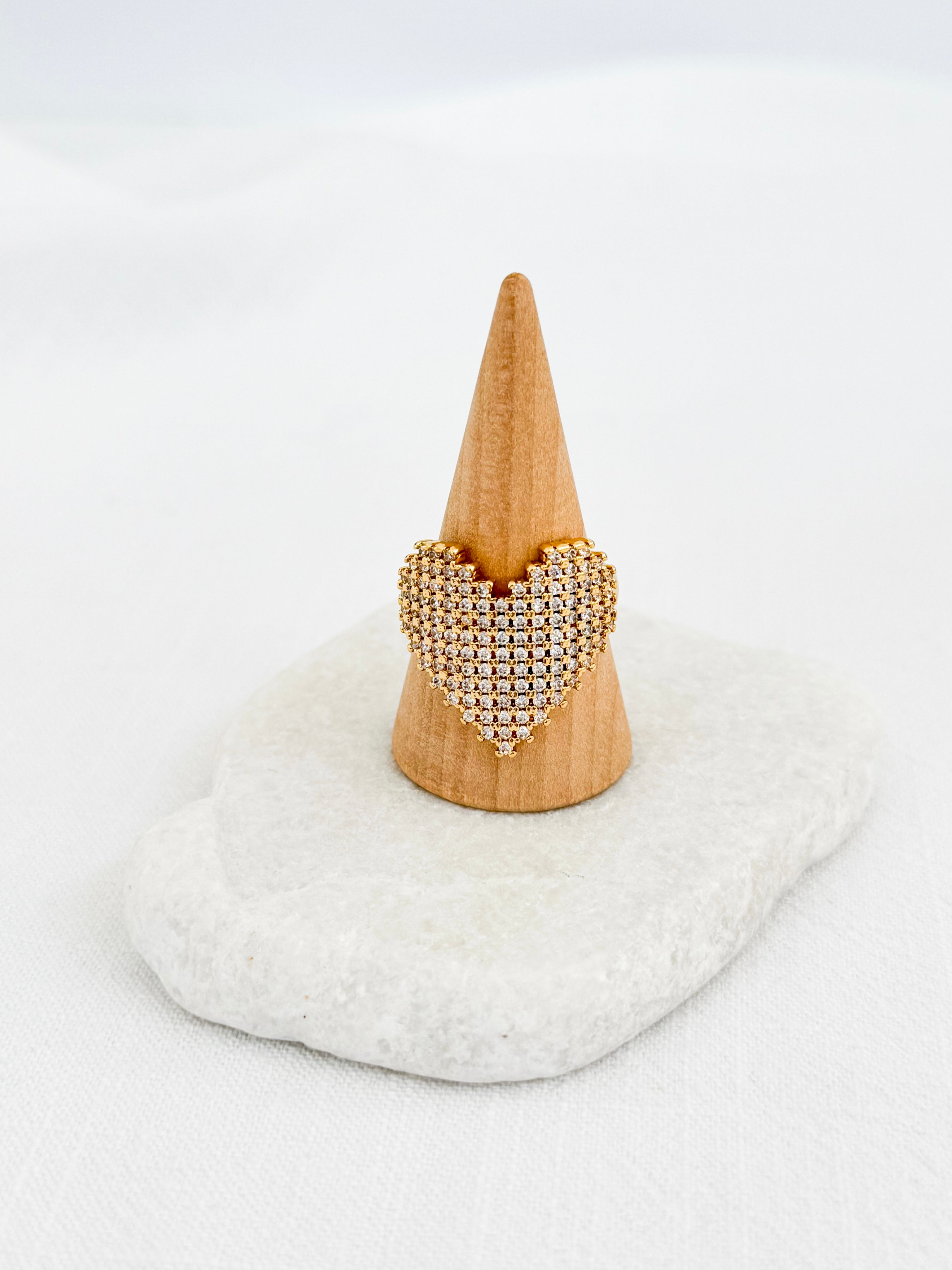 Add a radiant touch to your look with the India Ring. This heart-shaped design shimmers with pavé-set crystals on a gold-filled base, blending romance and sophistication. A timeless statement piece for your jewelry collection.