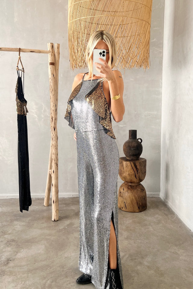 Shimmering sequins form a captivating pattern that enhances every move, making the Jazmin Jumpsuit a statement piece for any occasion. Crafted with expert attention to detail, it features a flattering fit, side slit, and a fluid drape that elongates the silhouette.