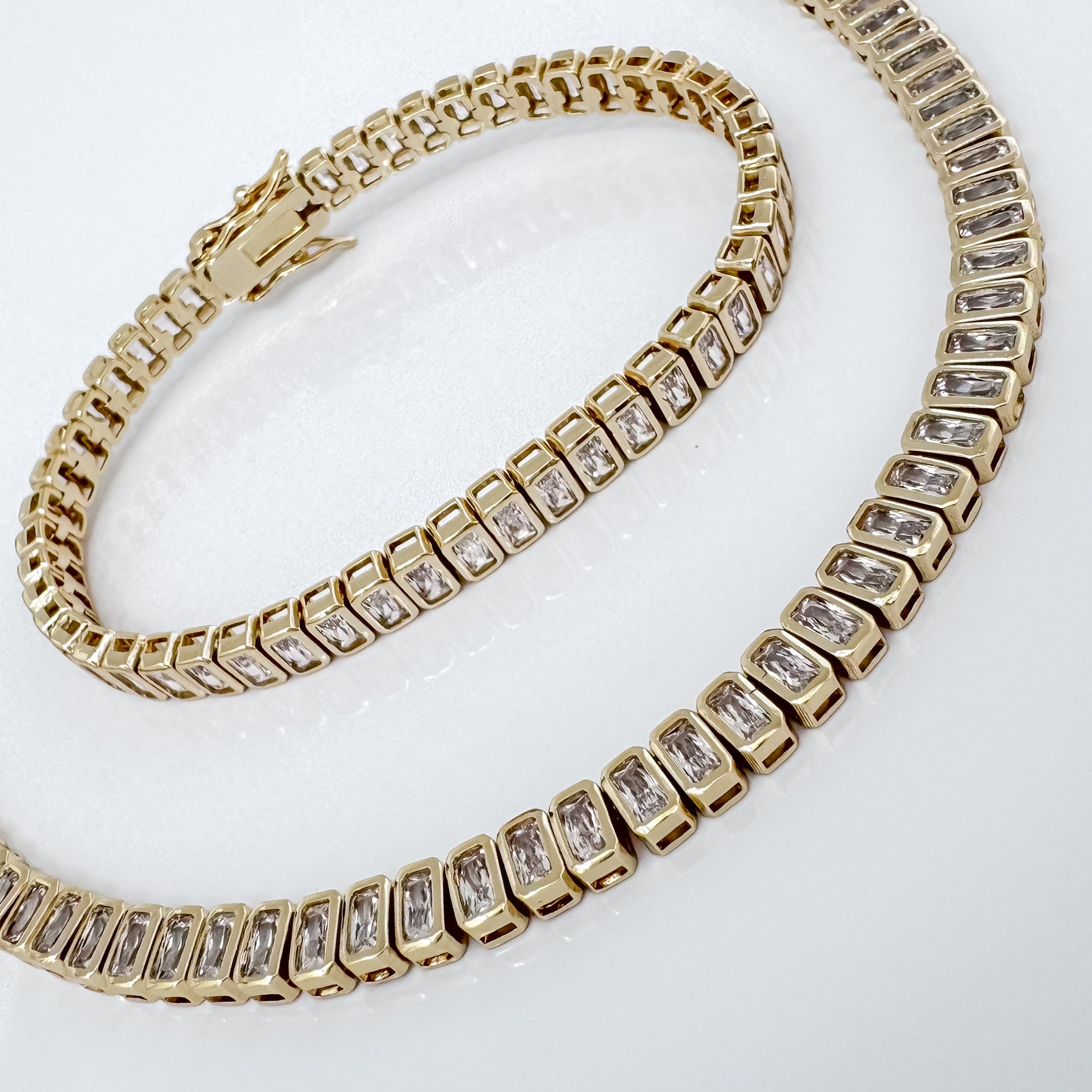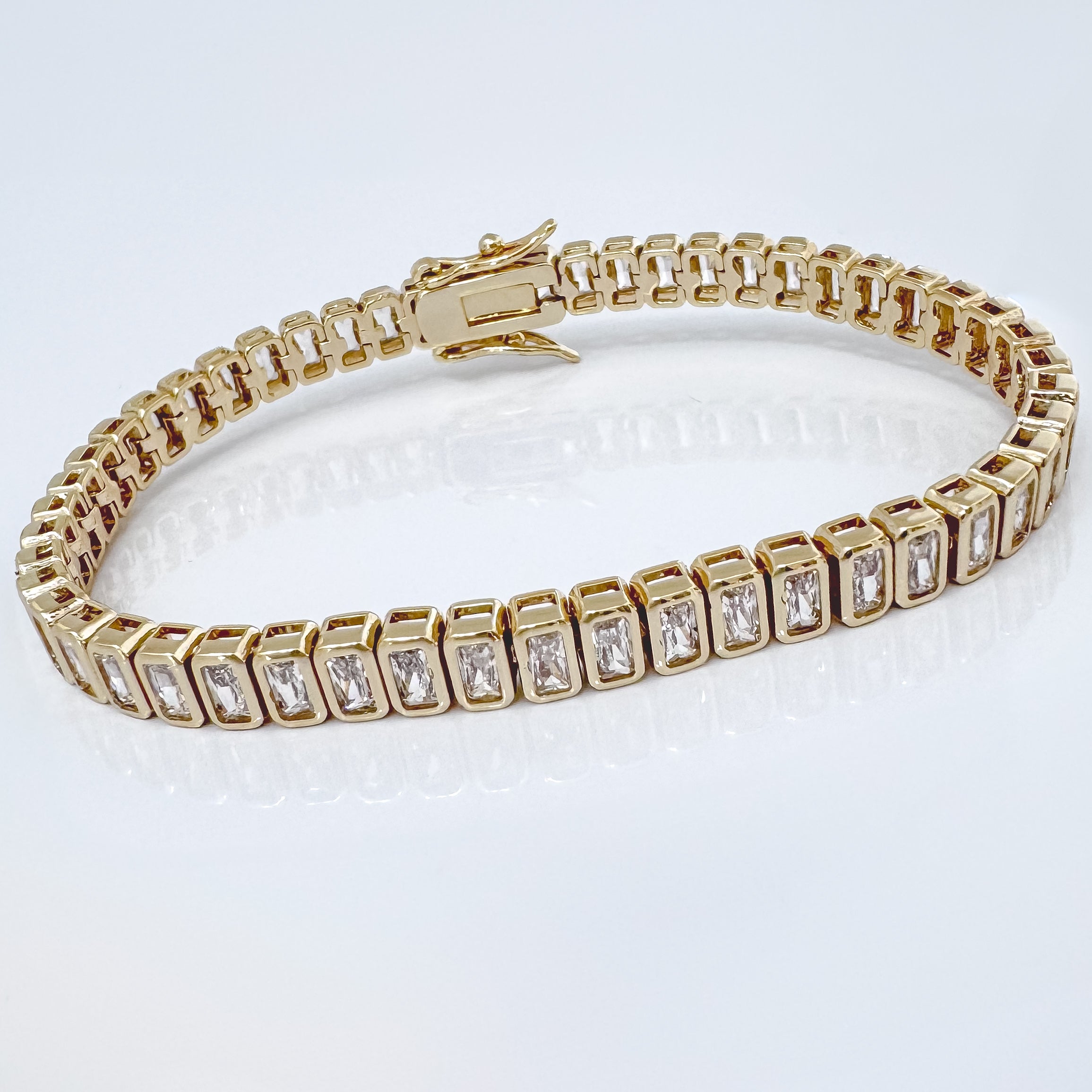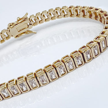 Refined, radiant, and designed to turn heads — the Lousa Bracelet features baguette-cut simulated diamonds in a sleek gold-filled setting. Its geometric sparkle brings a modern twist to a timeless silhouette. Perfect for special occasions or to elevate your everyday stack.