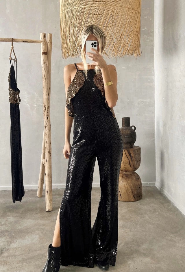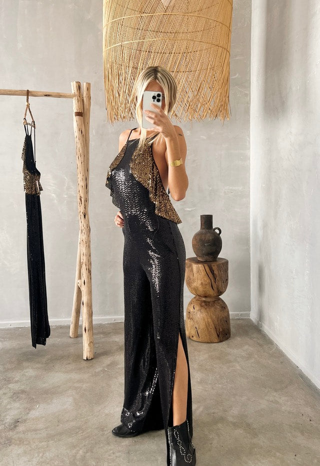 The Zeffa Jumpsuit redefines evening elegance with its sculptural silhouette and exquisite sequin detailing. This piece fuses artistry and glamour — every shimmering panel is placed to flatter the body and catch the light from every angle.