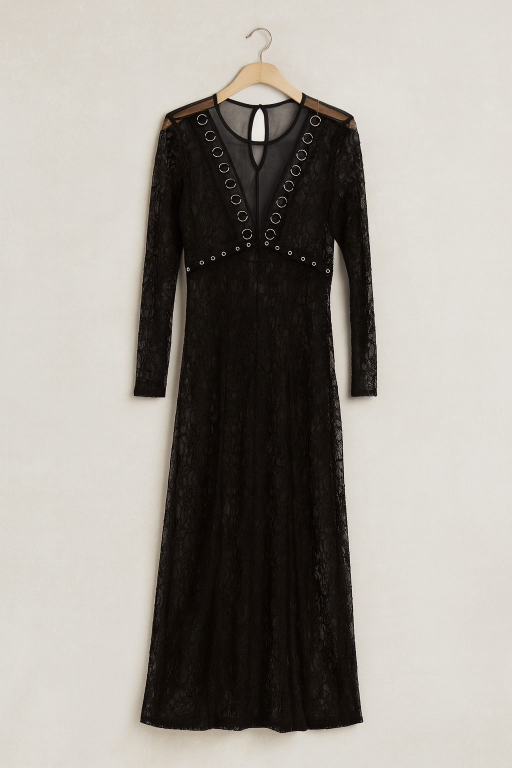 Long-sleeve black lace dress with sheer see-through details and metallic grommet accents. Designed to be worn layered or with a slip dress underneath for an elevated evening look.