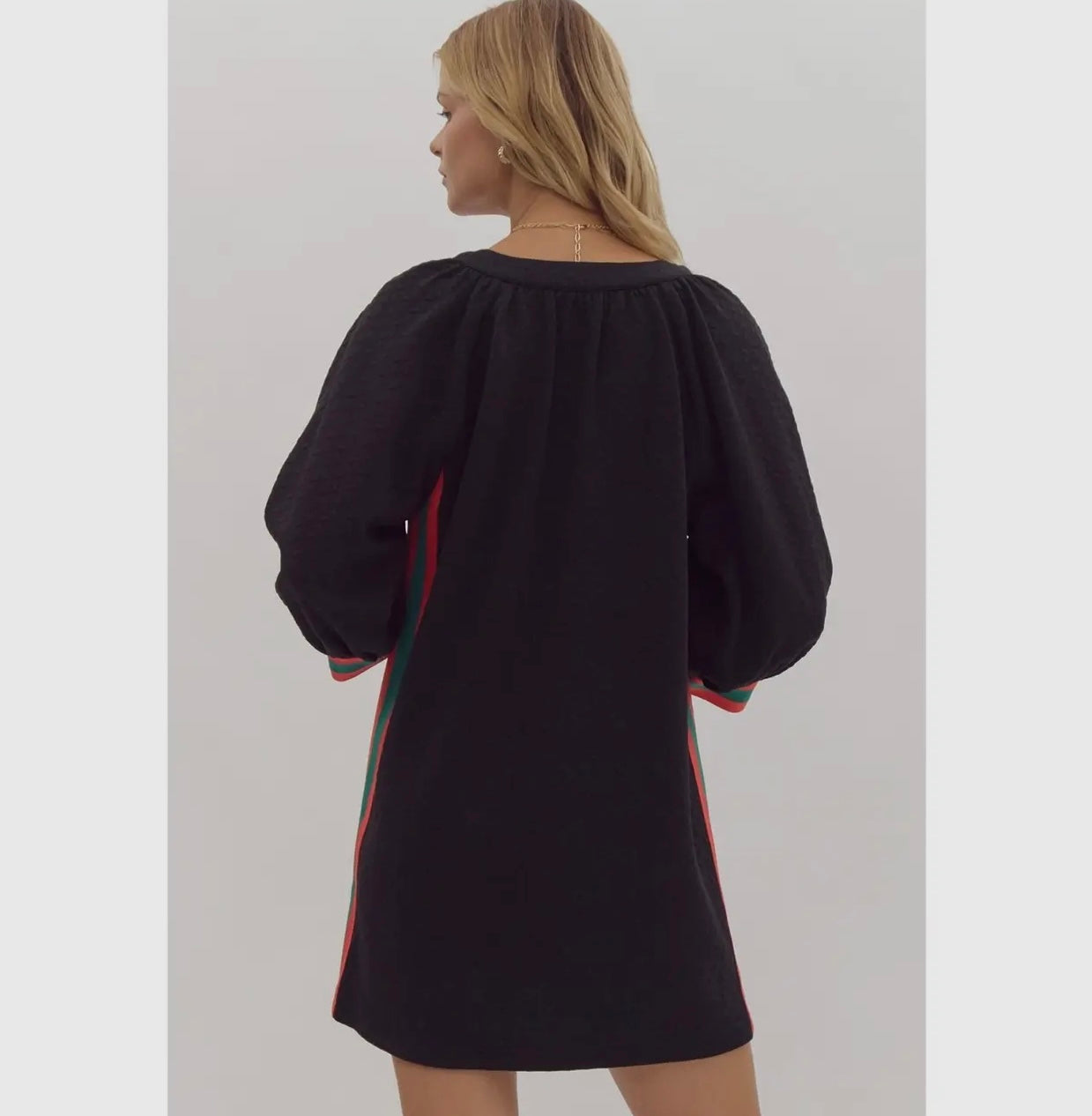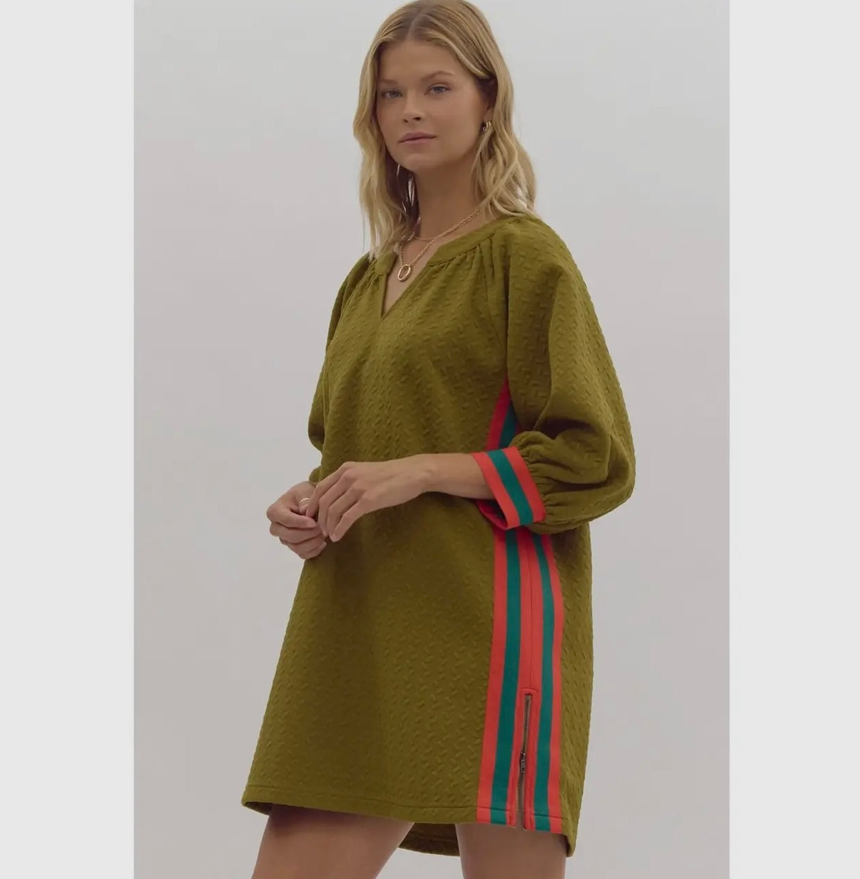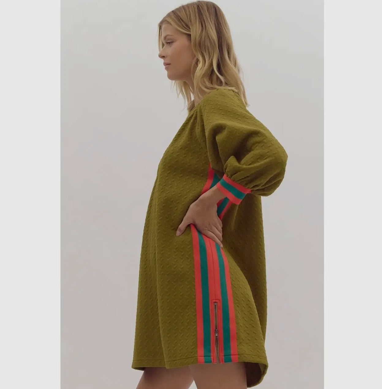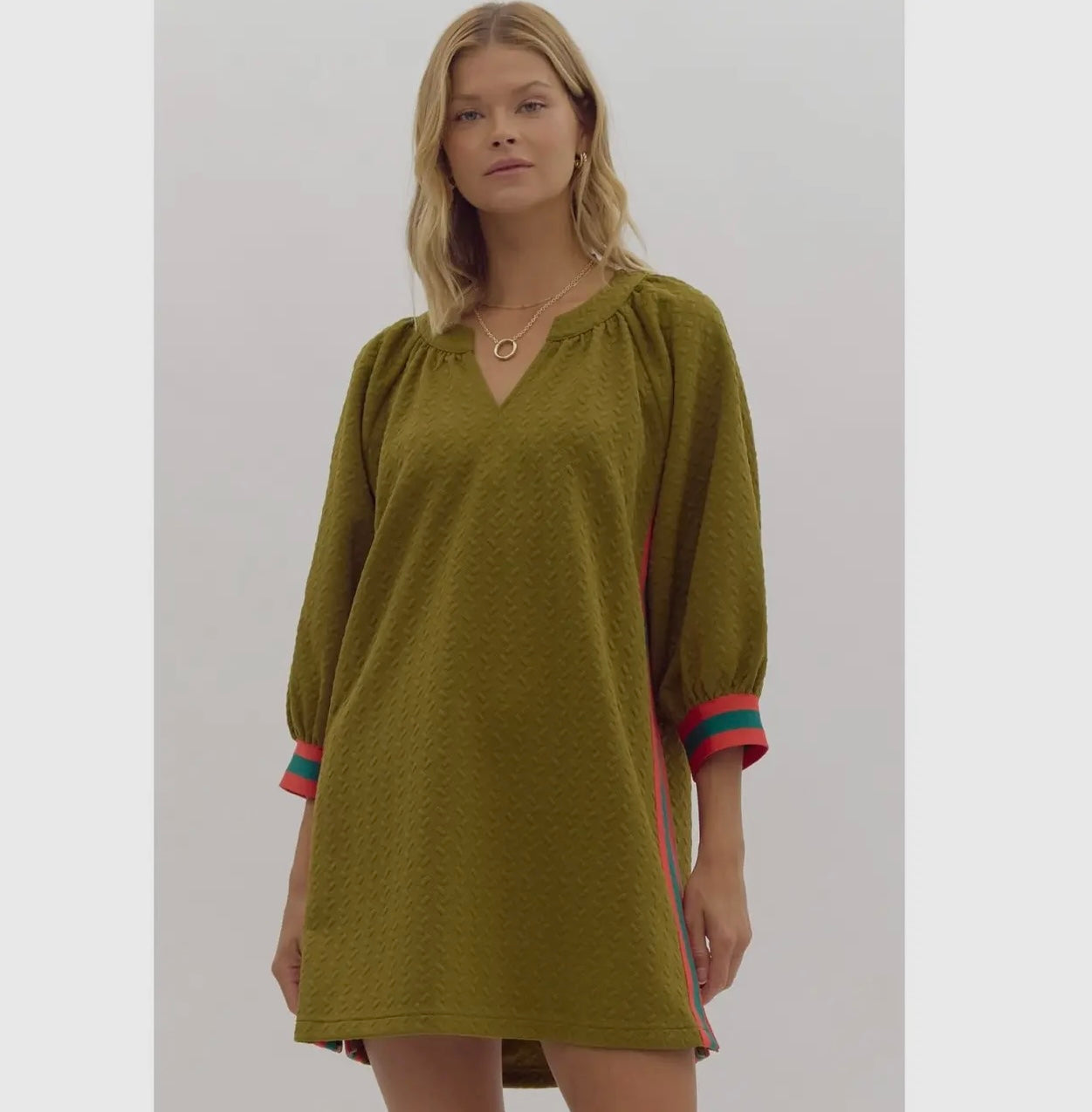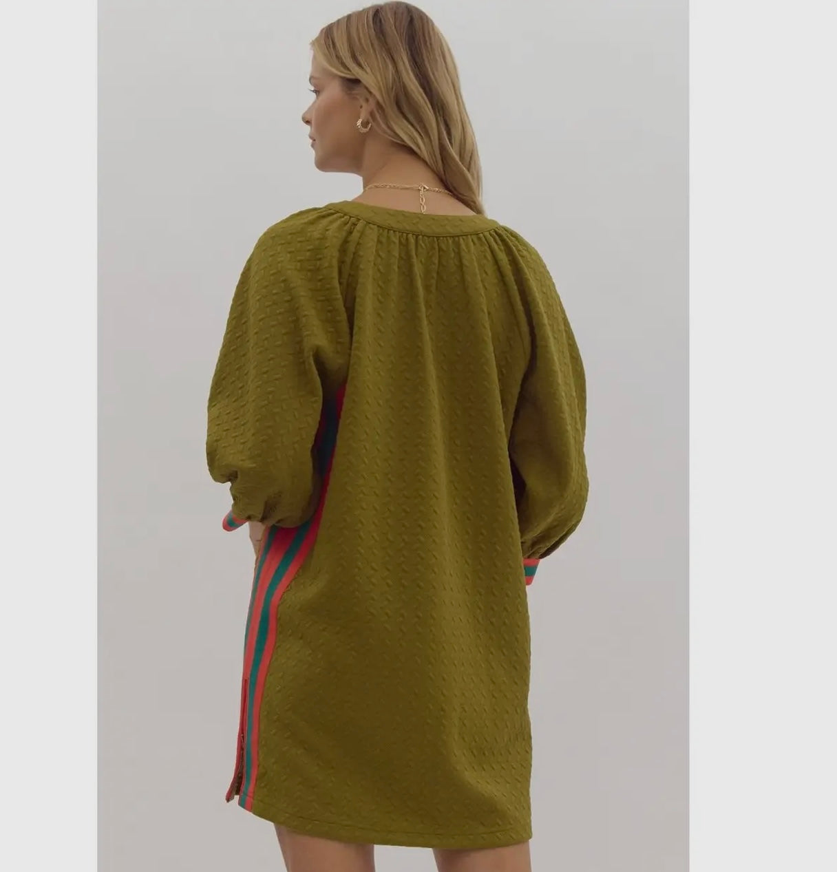 This dress has a relaxed, textured fabric in an olive green color with puffed sleeves and colorful side stripes in red and teal, giving it a unique, stylish look from the back. The flowy silhouette and bold accents make it versatile for casual outings or dressed-up events.
