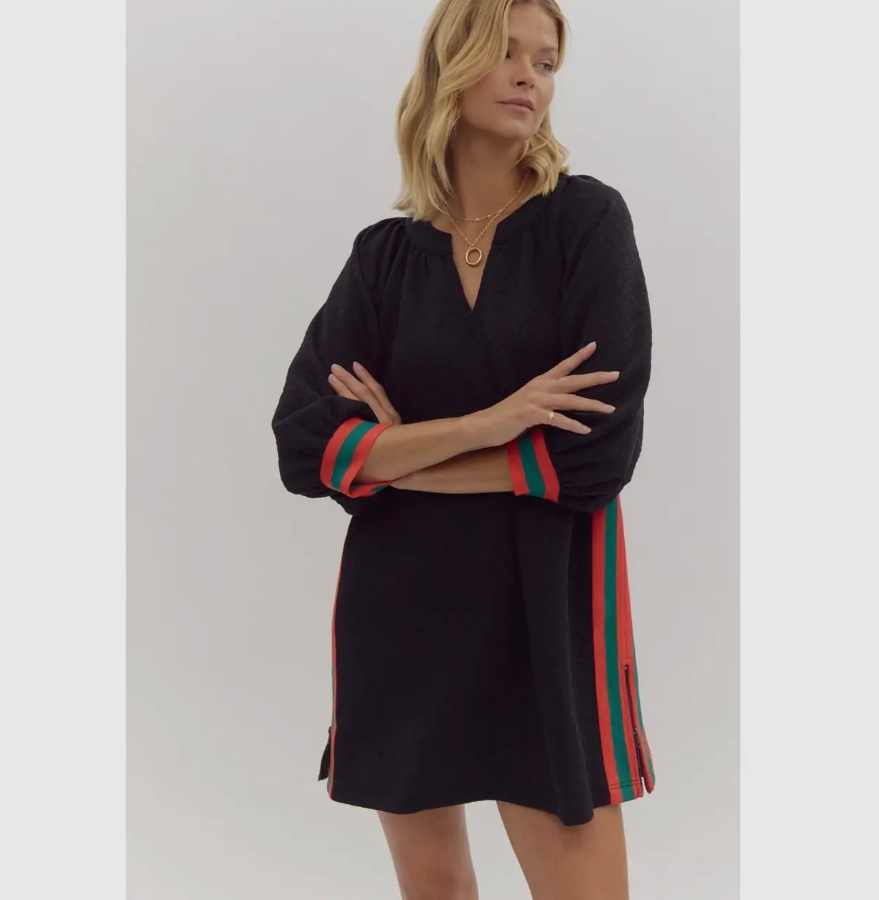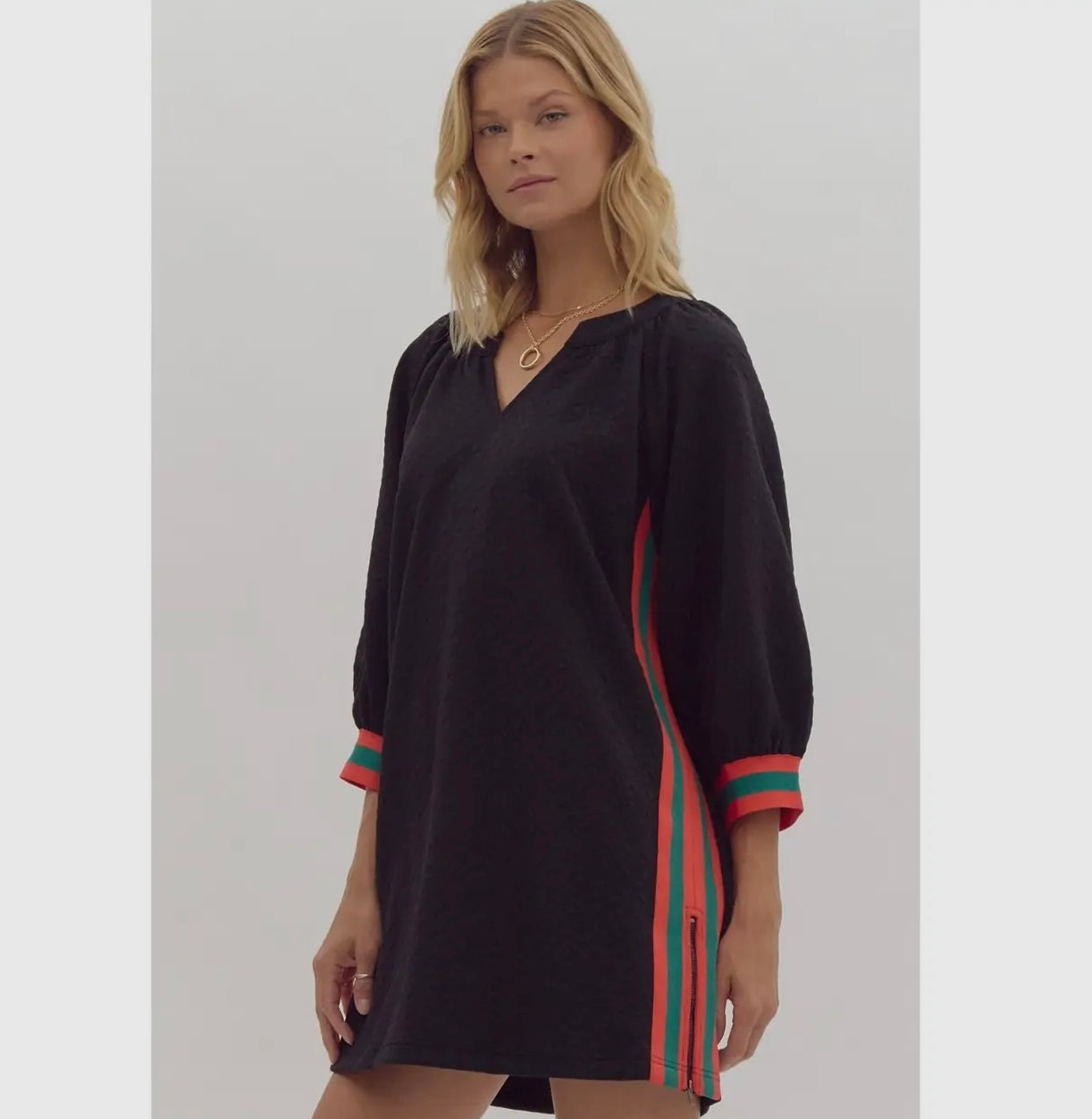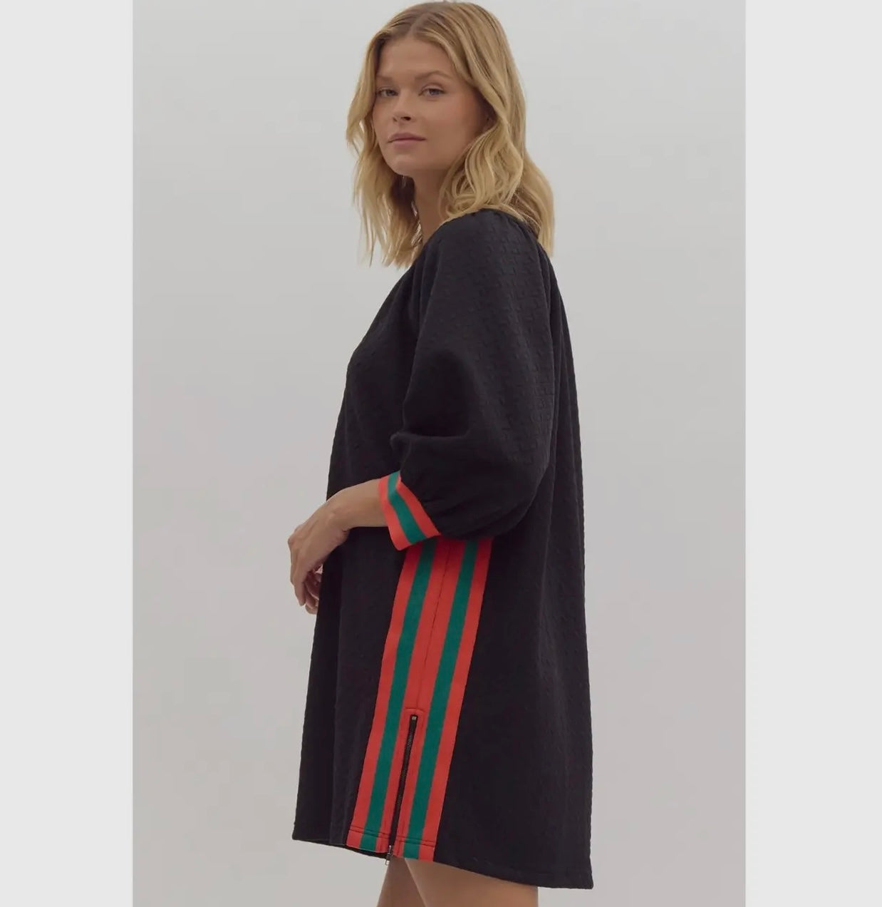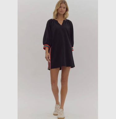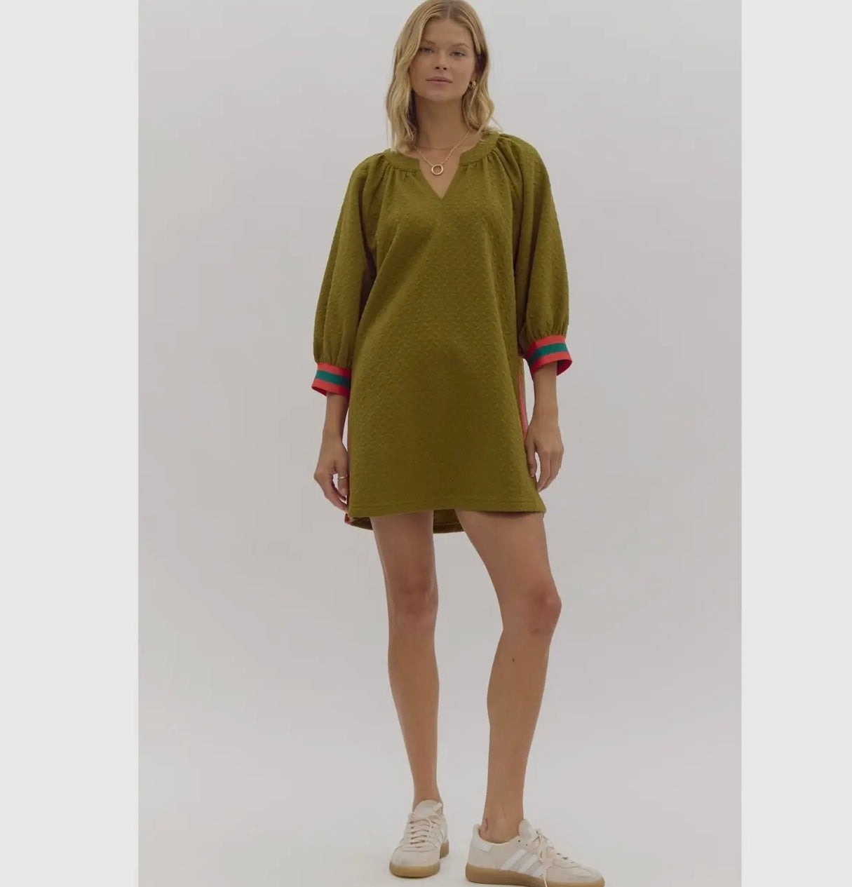 This dress has a relaxed, textured fabric in an olive green color with puffed sleeves and colorful side stripes in red and teal, giving it a unique, stylish look from the back. The flowy silhouette and bold accents make it versatile for casual outings or dressed-up events.