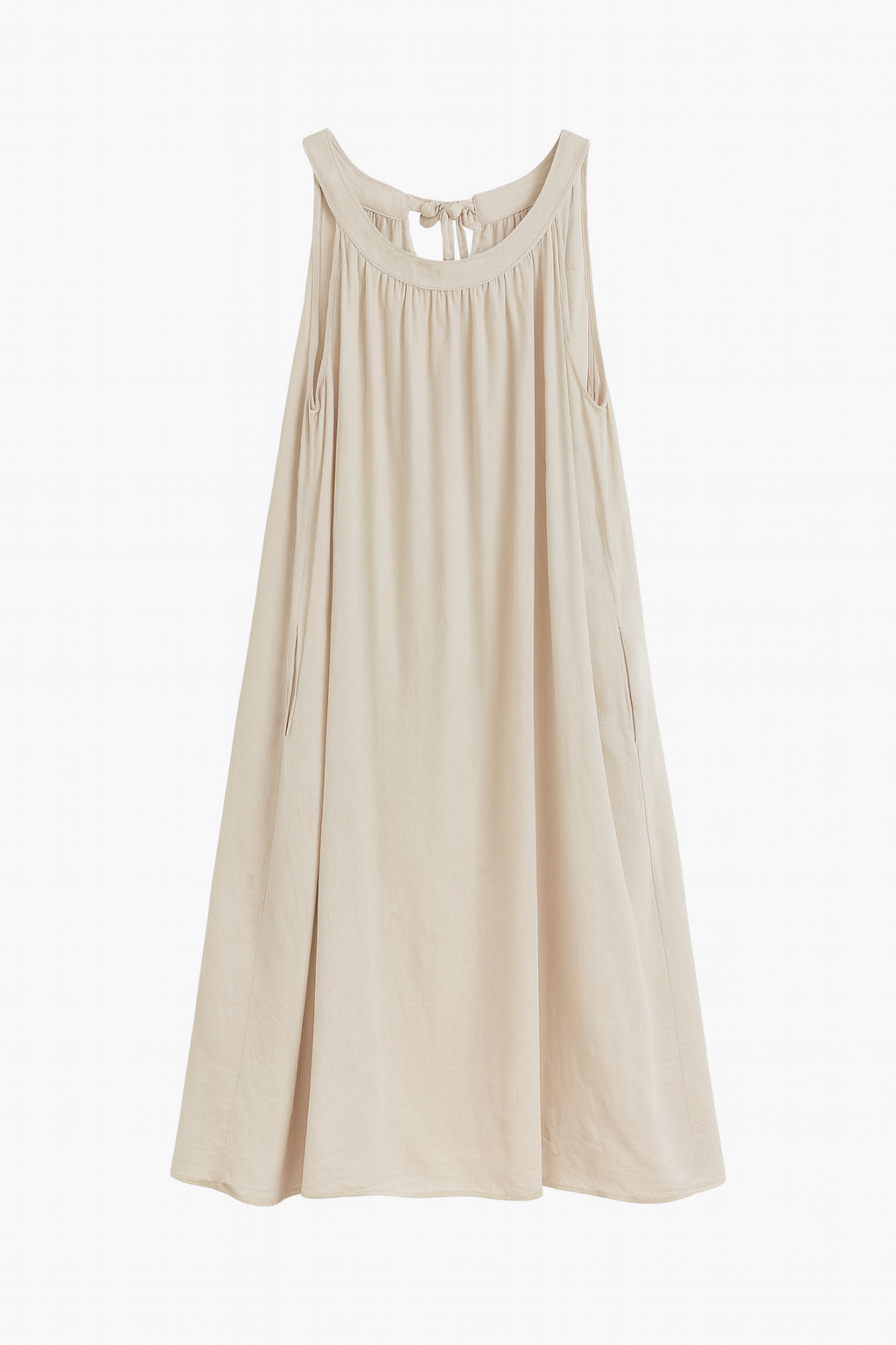Embrace the summer season with this elegant beige linen dress. Its airy, comfortable design is perfect for warm weather, making it a versatile addition to your wardrobe. The sleeveless style and relaxed fit offer a breezy feel, ideal for casual outings or beach days.